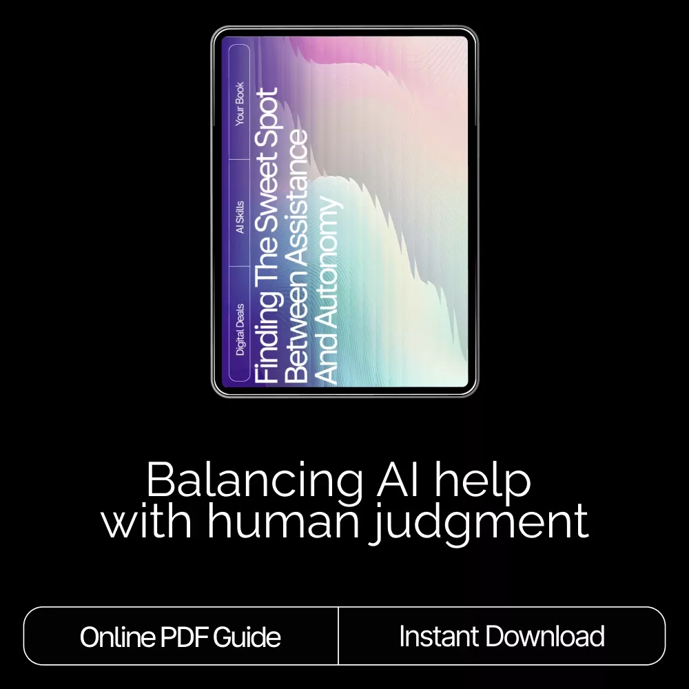 Step into the future of productivity and creativity with Finding the Sweet Spot Between Assistance and Autonomy—a digital eBook designed to help you understand how to balance AI help with your own judgment. Whether you’re a creator, entrepreneur, writer, or professional curious about the evolving world of artificial intelligence, this guide offers practical wisdom and real-world strategies to make AI your trusted co-pilot, not your replacement.