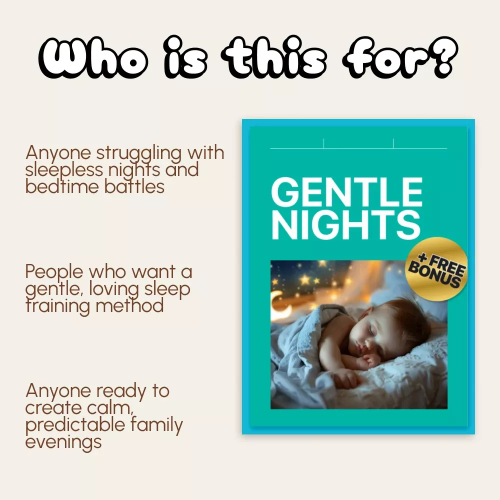 Gentle Nights is for parents, caregivers, and sleep-deprived families who want to encourage better sleep without harsh methods. Whether you’re starting sleep training for the first time or reestablishing routines after regressions, this guide meets you where you are — calm, kind, and supportive every step of the way.