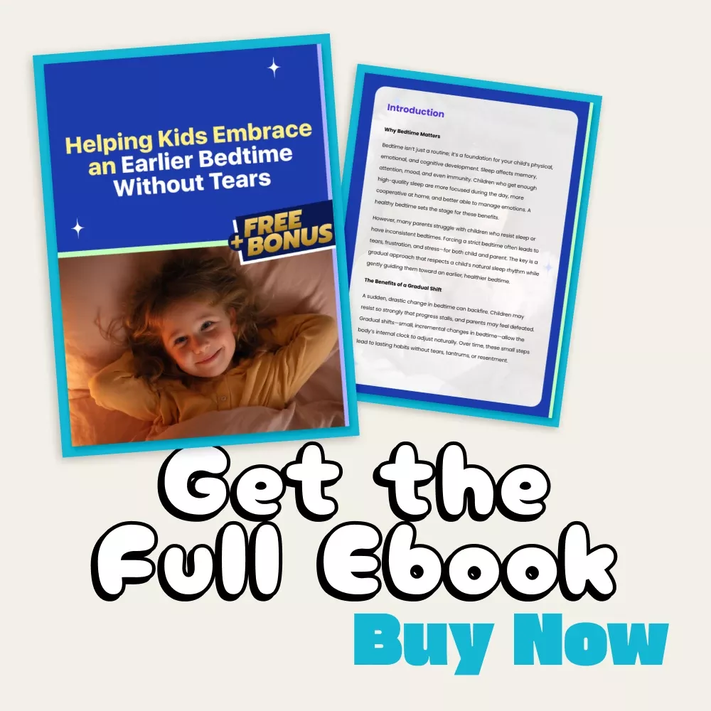 Discover the proven, gentle way to help your child fall asleep earlier—without the nightly tears and battles. Helping Kids Embrace an Earlier Bedtime Without Tears is a comprehensive digital eBook designed for parents who want to create calmer evenings and healthier sleep habits for their kids. Whether you’re navigating late-night struggles or just hoping to shift bedtime by a few minutes each night, this guide walks you through every step of how to shift bedtime gradually—with empathy, science, and structure.