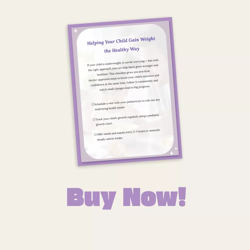 Is your little one struggling to gain weight? Helping Your Child Gain Weight the Healthy Way is a thoughtfully designed printable checklist created by child nutrition experts to help parents navigate this common concern with confidence and calm. Whether your child is a picky eater or recovering from illness, this easy-to-follow guide shows you exactly what to do if child is underweight—all in one simple, actionable resource you can start using today. Perfect for busy parents who want a practical plan that promotes healthy, long-term growth.