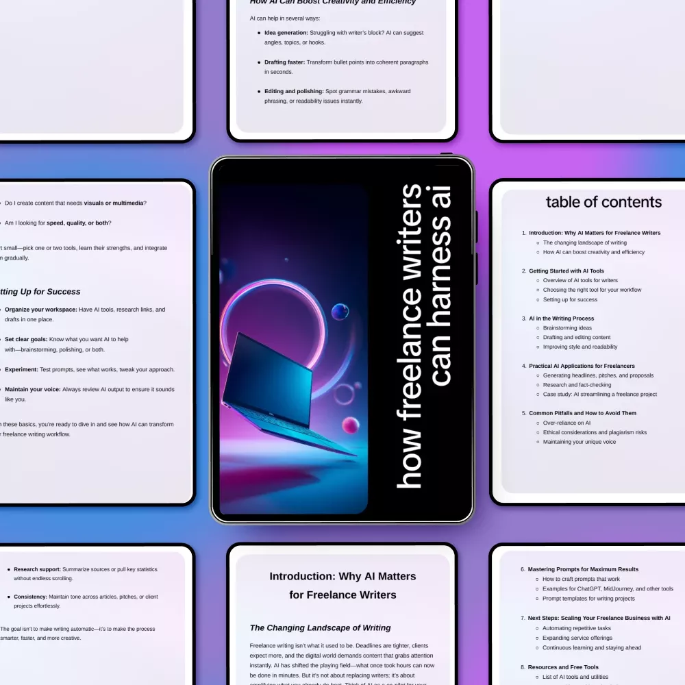 Unlike generic AI tutorials, this resource focuses specifically on freelance writing workflows. It emphasizes ethical use, voice preservation, and real client scenarios—so you can stand out, not blend in.