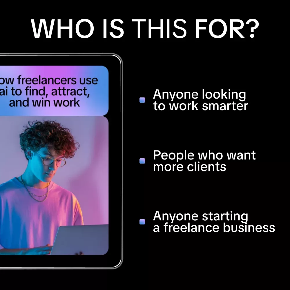 This guide is perfect for freelancers, solopreneurs, and independent professionals who want to work smarter, attract higher-quality clients, and stop relying on endless pitching or freelance marketplaces. If you’re ready to leverage AI for freelancers to find clients, this eBook gives you a practical roadmap.