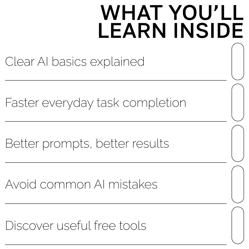 Unlike generic AI overviews, this resource focuses on real-life usefulness. It helps you avoid common mistakes, choose the right tools, and apply AI in ways that genuinely save time and elevate your work. The explanations are simple, friendly, and designed for true beginners—no tech jargon required.
