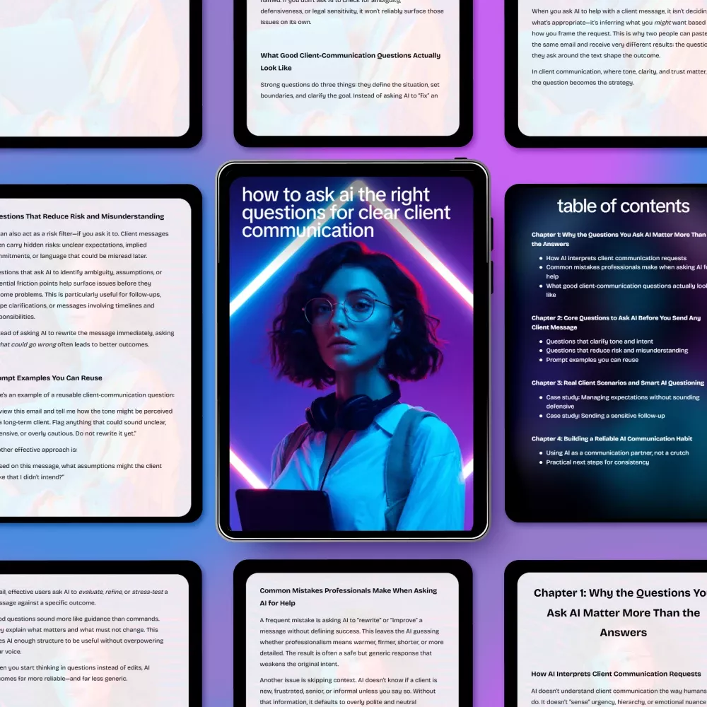- Chapter 2: Core Questions to Ask AI Before You Send Any Client Message – Learn questions that clarify tone and intent, reduce risk, and ready-to-use prompt examples.