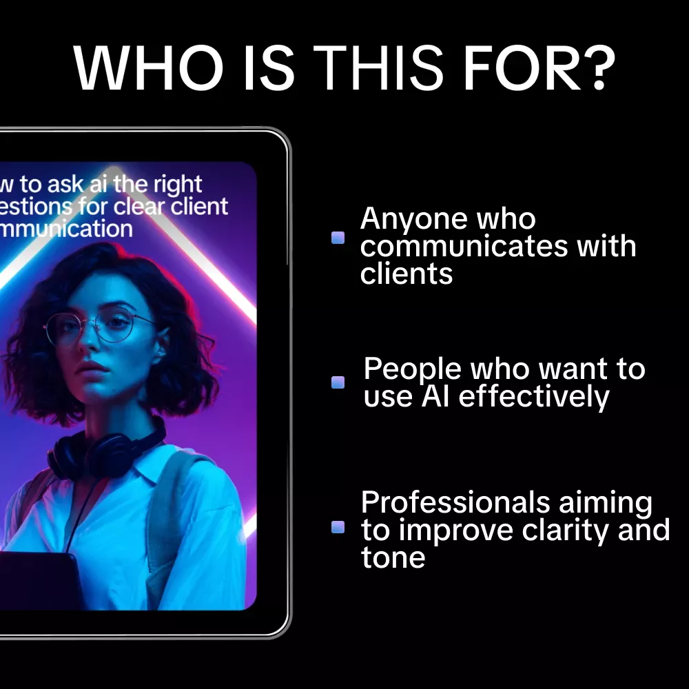 Unlike generic AI guides, this resource focuses specifically on client communication. It combines practical question frameworks, real-world scenarios, and easy-to-apply prompts, making it actionable from day one. You don’t just learn theory—you gain tools you can use immediately to improve client relationships and messaging outcomes.