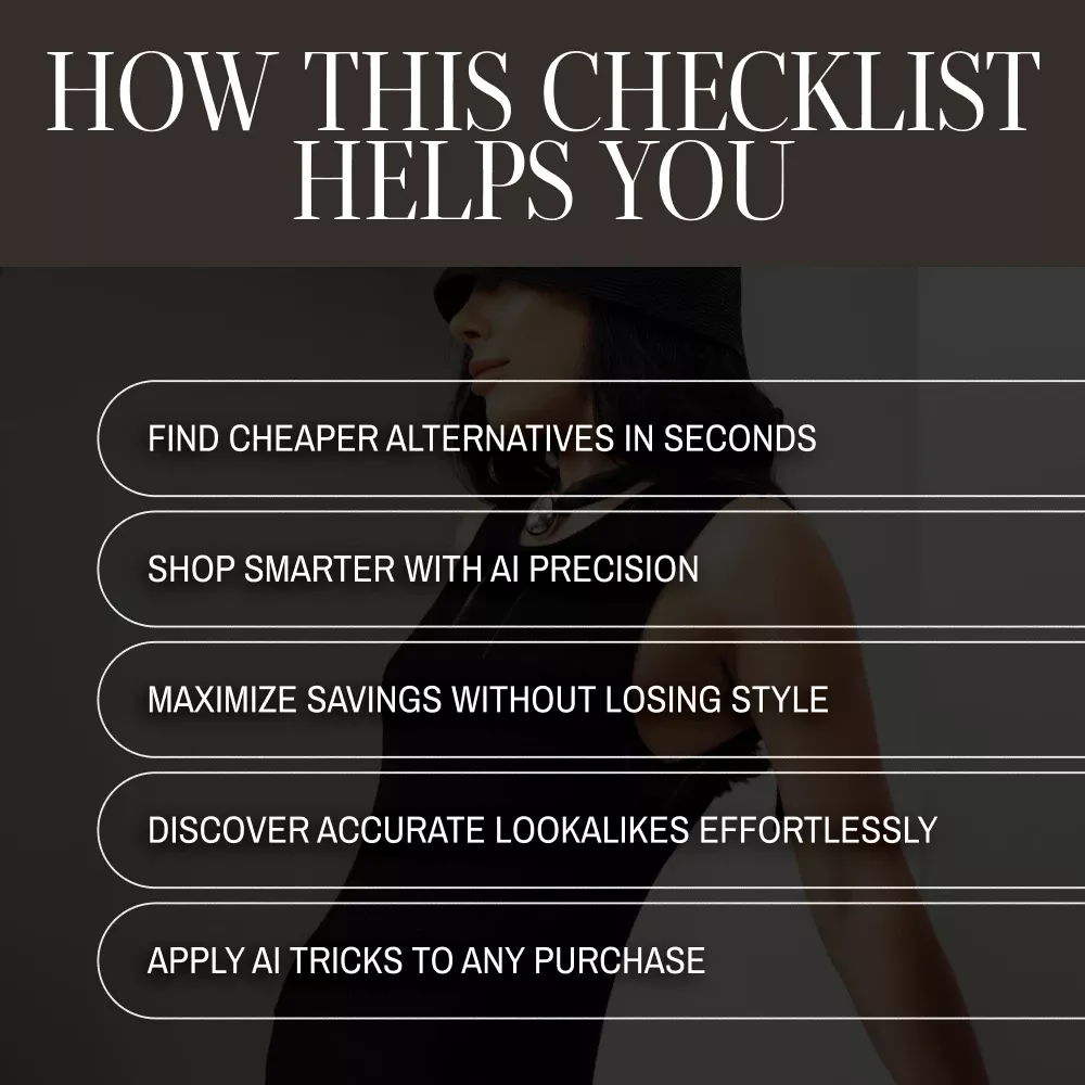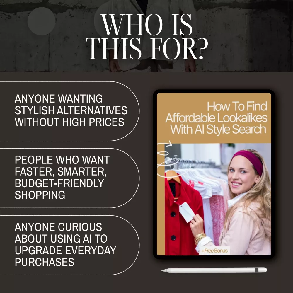 Unlike generic shopping guides, this resource teaches how to use AI tools strategically, not just where to shop. You’ll learn how to transform any inspo image into low-cost alternatives—giving you control, accuracy, and endless options.