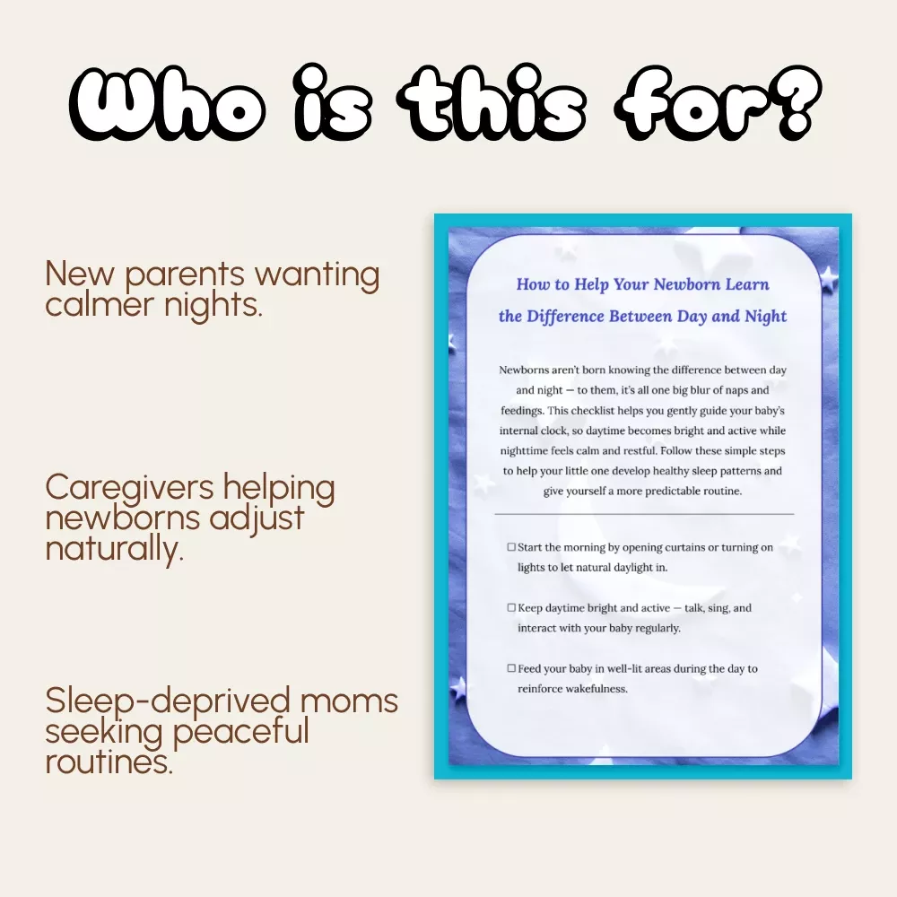 Start creating peaceful nights and brighter days today. Download How to Help Your Newborn Learn the Difference Between Day and Night and enjoy a calmer, more predictable routine for you and your baby. Instantly available after purchase — your gentle sleep transformation begins now!