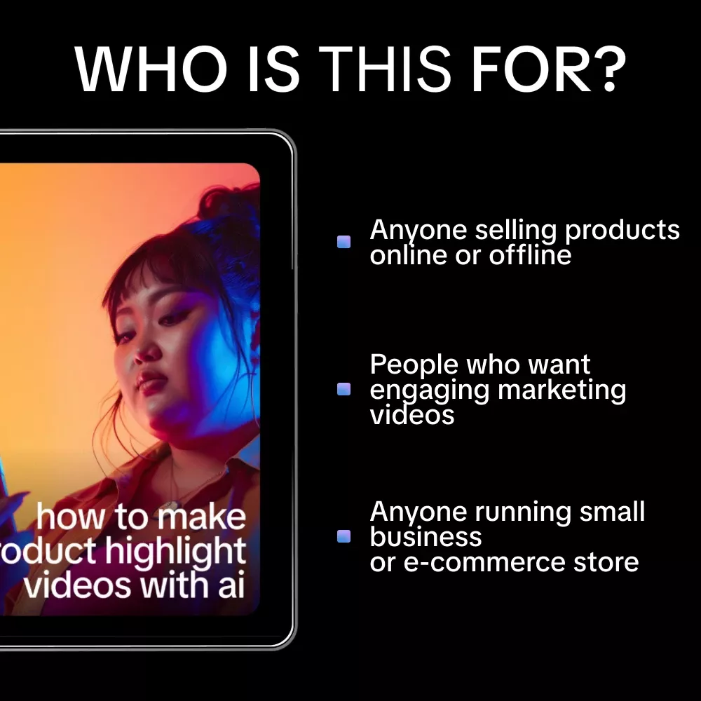 This checklist is perfect for anyone looking to elevate their online product presentation. If you sell physical products, create digital products, or run a marketing agency, this guide simplifies the video creation process and helps you produce videos that grab attention. Unlike generic video guides, this checklist focuses on exactly how to create product highlight videos with AI, offering actionable steps, tips, and practical workflows for real results.
