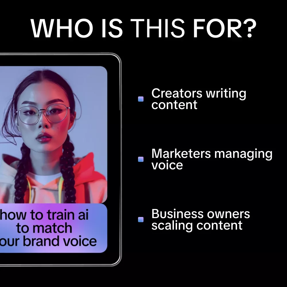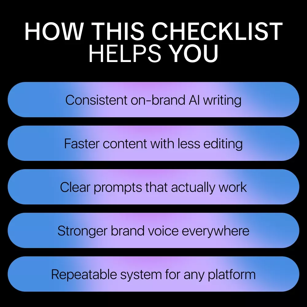 Unlike generic AI guides, this checklist is focused entirely on brand voice consistency. It’s concise, actionable, and designed to be reused again and again as your brand evolves. No fluff, no jargon—just a clear framework that works across tools and platforms.