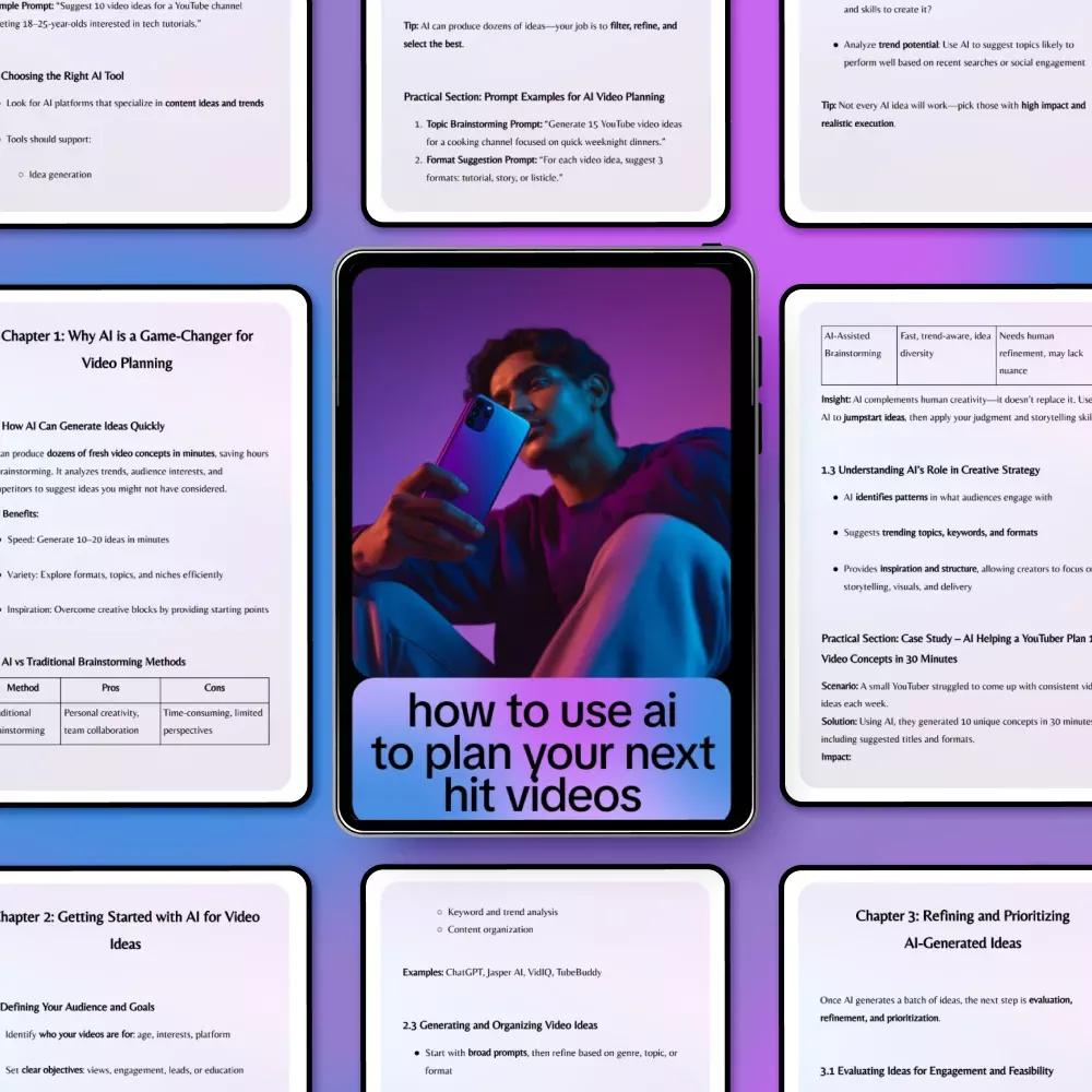 - Chapter 1: Why AI is a Game-Changer for Video Planning – Learn how AI generates ideas faster than traditional methods and see a real-world case study of planning 10 video concepts in just 30 minutes.