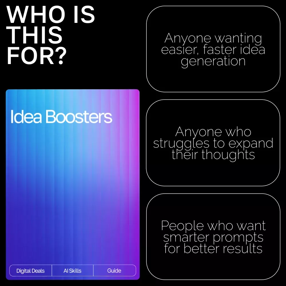 Take your creativity further with Idea Boosters—a practical, easy-to-use guide designed to help you stretch a single thought into powerful new possibilities. Whether you’re brainstorming for a project, planning content, solving problems, or simply looking to think more creatively, this digital download gives you the tools to expand your ideas with confidence. Thoughtfully crafted and infused with ai prompts for expanding ideas, it helps you turn mental sparks into fully formed concepts you can use.