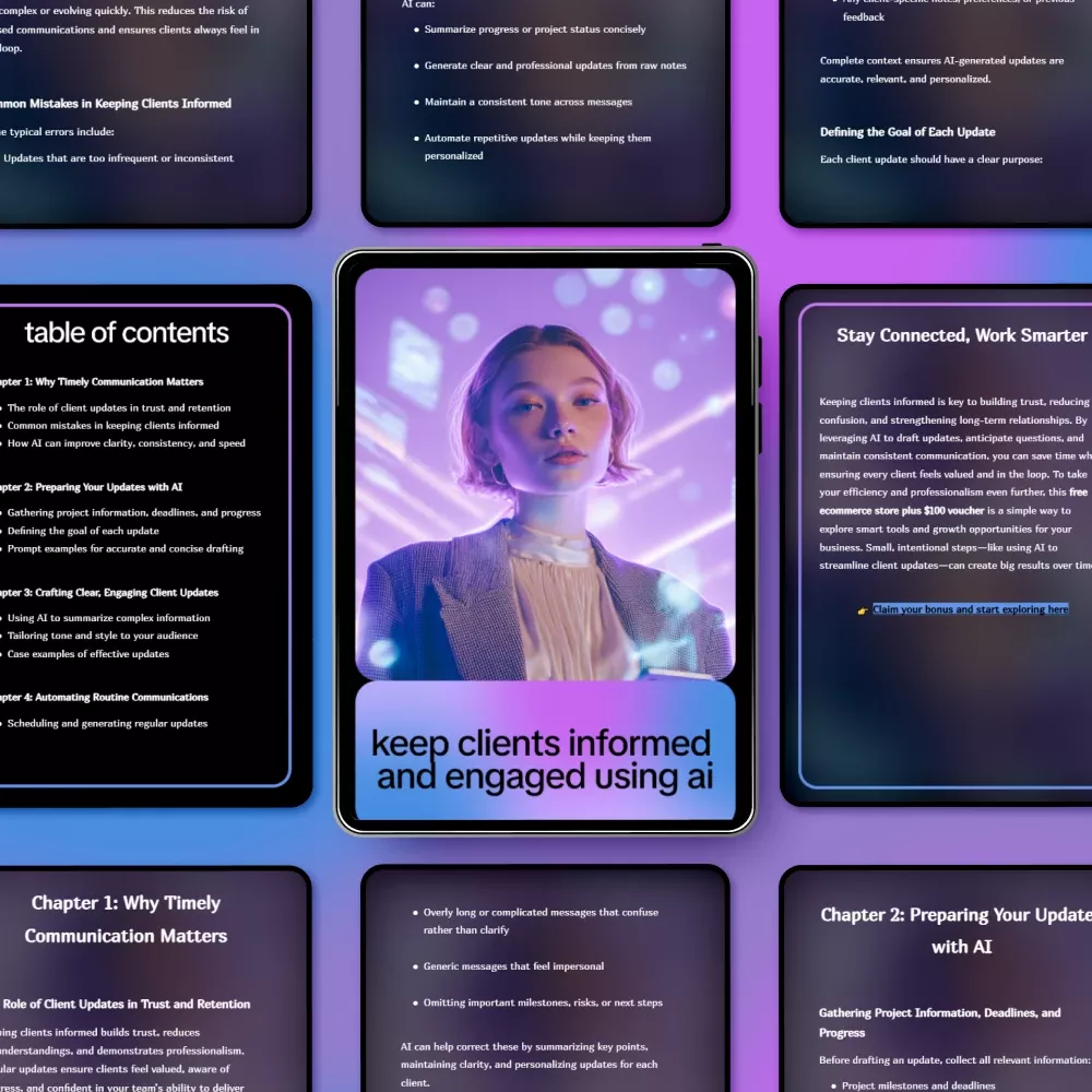 Keeping clients informed and engaged is one of the most important parts of running a successful business. Keep Clients Informed and Engaged Using AI is a comprehensive digital eBook designed to show you practical ways to use AI to keep clients informed effectively, consistently, and with minimal effort. Whether you’re a freelancer, consultant, agency owner, or project manager, this guide gives you the tools to streamline client communication, enhance trust, and boost satisfaction—all with the help of AI.