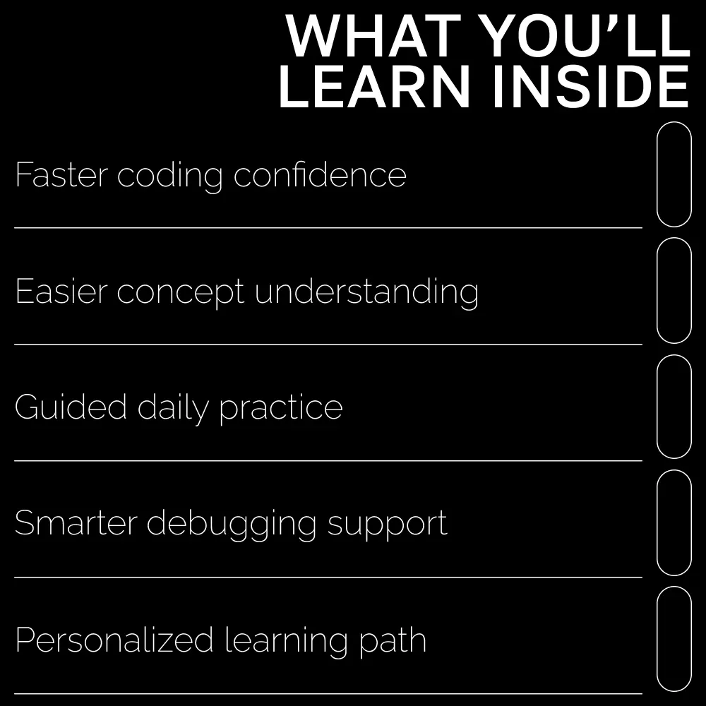 Unlike generic coding guides, this eBook teaches you how to turn AI into a supportive learning partner—not a shortcut. You’ll learn how to ask better questions, practice smartly, and build confidence through guided repetition and real examples.