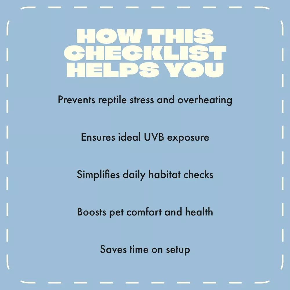 Unlike generic care sheets, this checklist combines expert-backed care advice with actionable steps tailored to your specific lizard species. It simplifies the science of reptile thermoregulation into an easy daily routine—so you can stop guessing and start creating the perfect habitat.