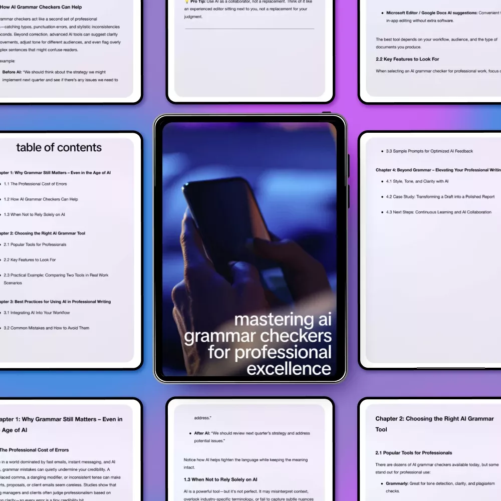Clear, confident writing still defines professional credibility—even in a world powered by AI. Mastering AI Grammar Checkers for Professional Excellence is a practical, easy-to-follow digital guide designed to help you use AI tools smarter, not blindly. Instead of relying on guesswork or generic corrections, this guide shows you how to collaborate effectively with an ai grammar checker for professional work to produce polished, accurate, and impactful writing every time.