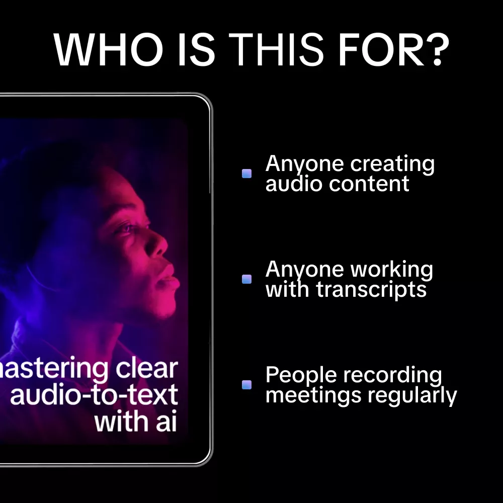 This ebook is ideal for content creators, podcasters, students, journalists, virtual assistants, business owners, researchers, and anyone who relies on audio-to-text tools for work or study.