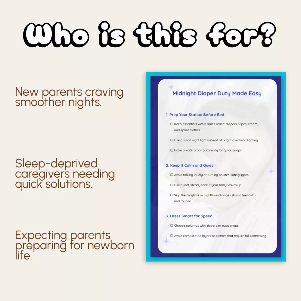 Unlike lengthy guides or generic parenting blogs, Midnight Diaper Duty Made Easy delivers everything you need in one quick, easy-to-use resource. Designed with clarity, warmth, and real-life practicality, it transforms your nights from stressful to serene. With focused tips for nighttime diaper changes, you’ll master the art of quiet, gentle care — and get back to sleep faster.