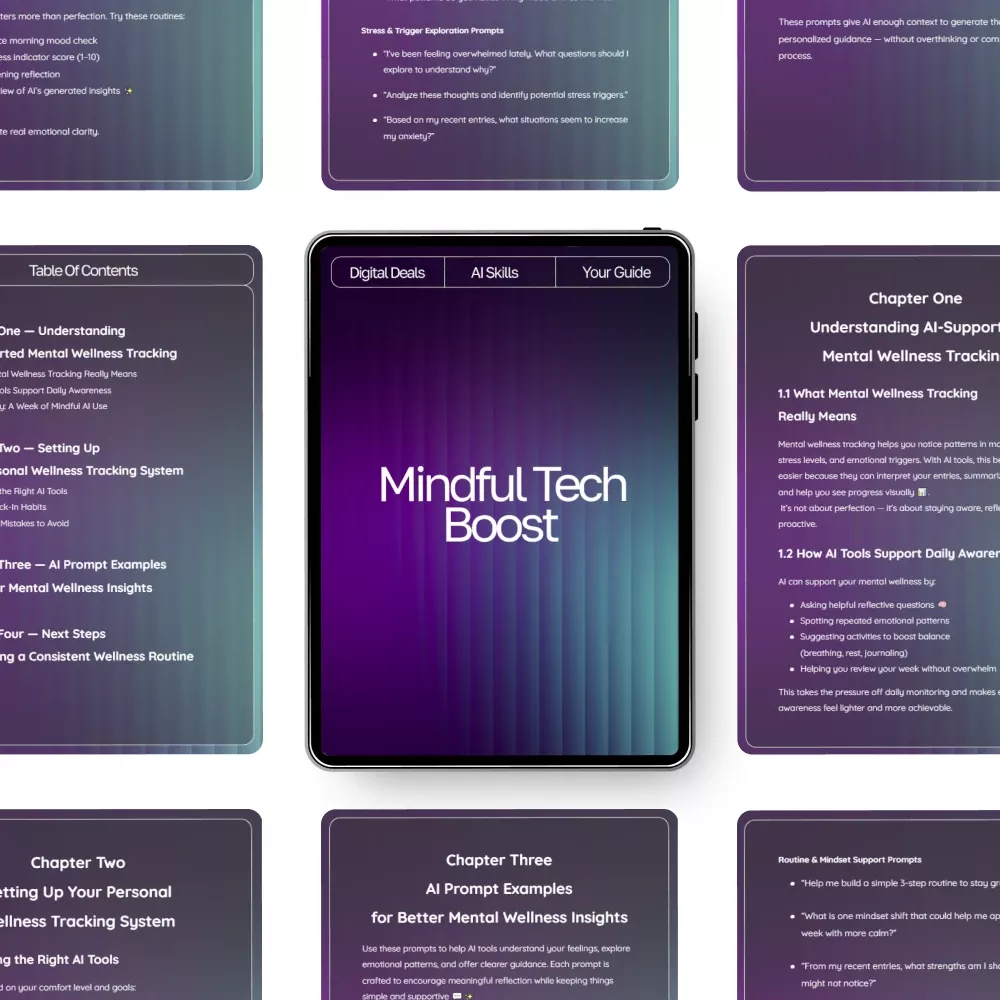 Mindful Tech Boost is a calming, practical digital guide that helps you connect technology with mindfulness in a meaningful way. Designed for anyone curious about ai help for tracking mental wellness, this guide shows how AI can support your self-awareness, track emotional patterns, and encourage consistent, mindful routines. It blends the best of digital innovation with emotional care, helping you understand yourself better while keeping balance and privacy at the center of your wellness journey.