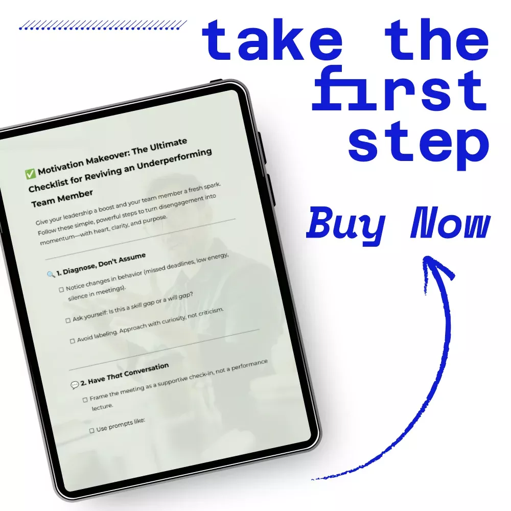 Download Motivation Makeover: The Ultimate Checklist for Reviving an Underperforming Team Member now and start transforming challenges into growth, one step at a time. Take action today and watch your team member regain confidence, engagement, and results!