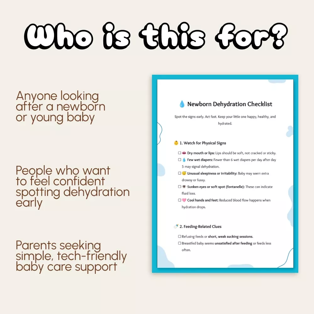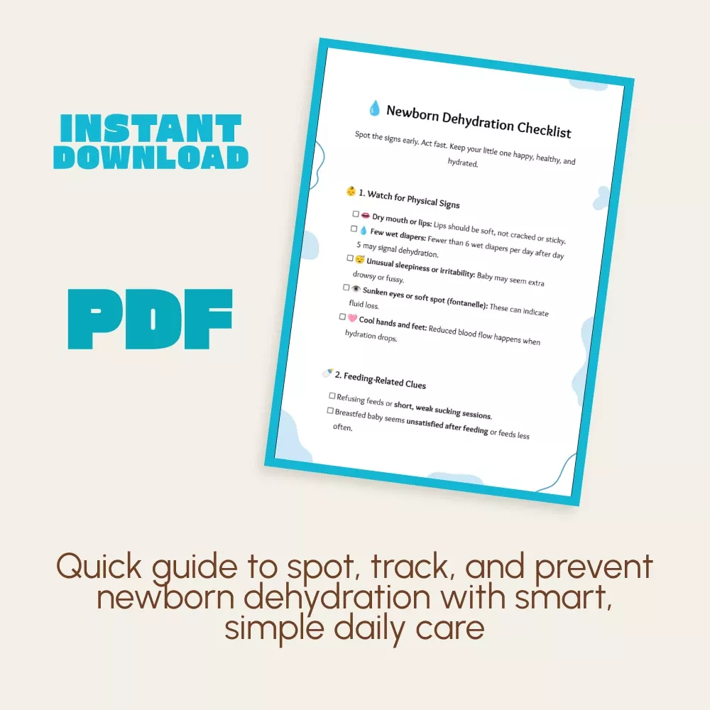 Worried about your newborn’s hydration? The Newborn Dehydration Checklist is a must-have digital guide for new parents who want peace of mind and expert-backed insight into what signs of dehydration in newborn to look for. Designed for quick, everyday use, this printable and digital checklist helps you confidently track feeding, diapers, and hydration indicators — so you can act early and keep your baby healthy, safe, and thriving.