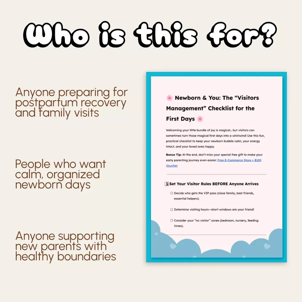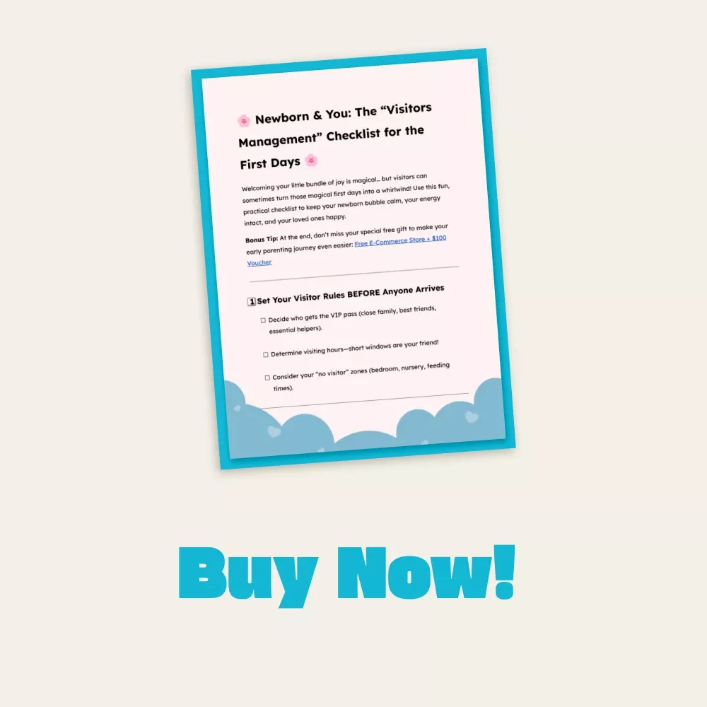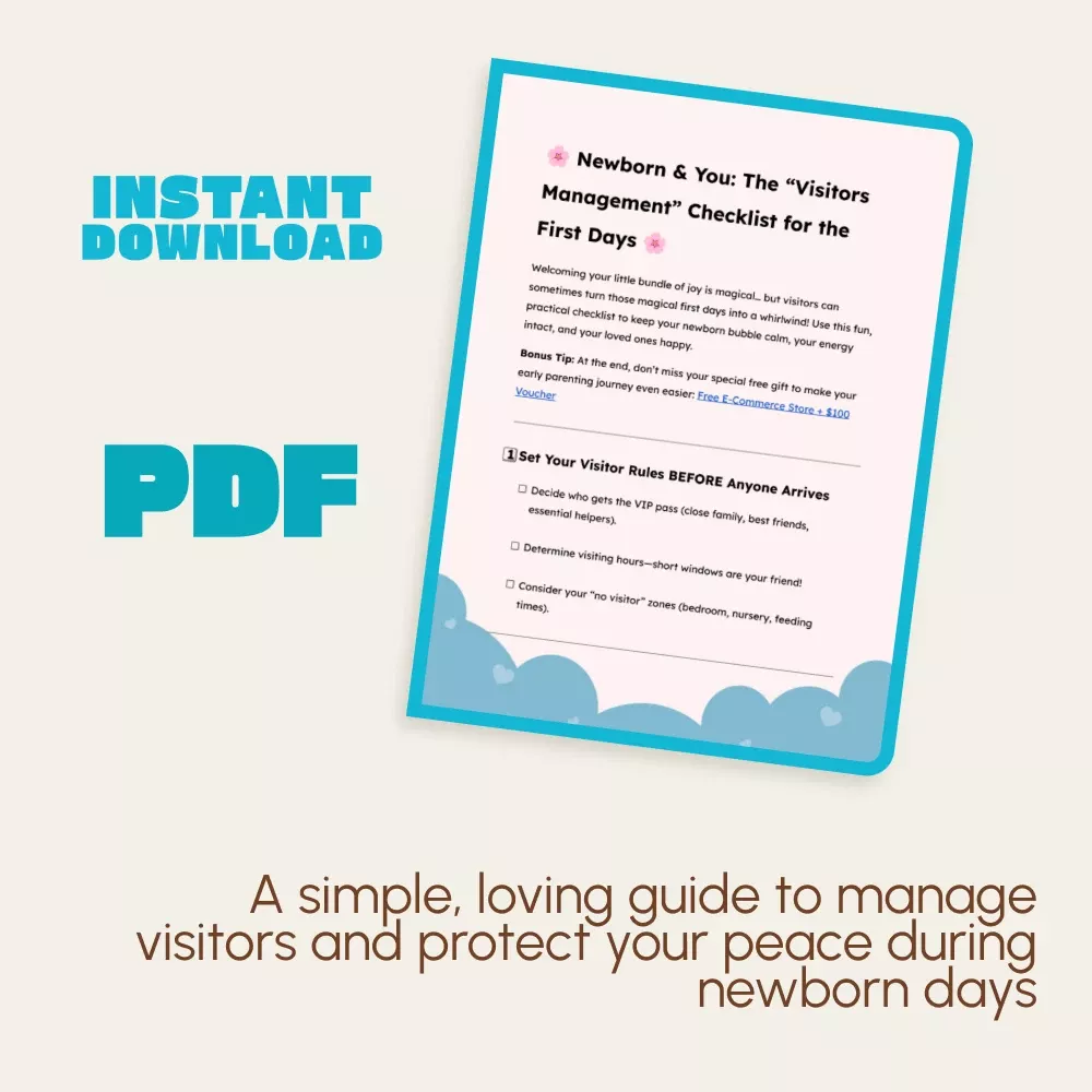 Welcoming your newborn is magical—but it can also feel overwhelming when everyone wants to visit. Newborn & You: The “Visitors Management” Checklist for the First Days is a beautifully designed, easy-to-follow digital download created to help new parents protect their peace, set loving boundaries, and enjoy those sacred early moments with confidence. Whether you’re a first-time mom, partner, or supportive friend, this guide gives you the clarity and confidence to manage well-wishers without guilt or stress.