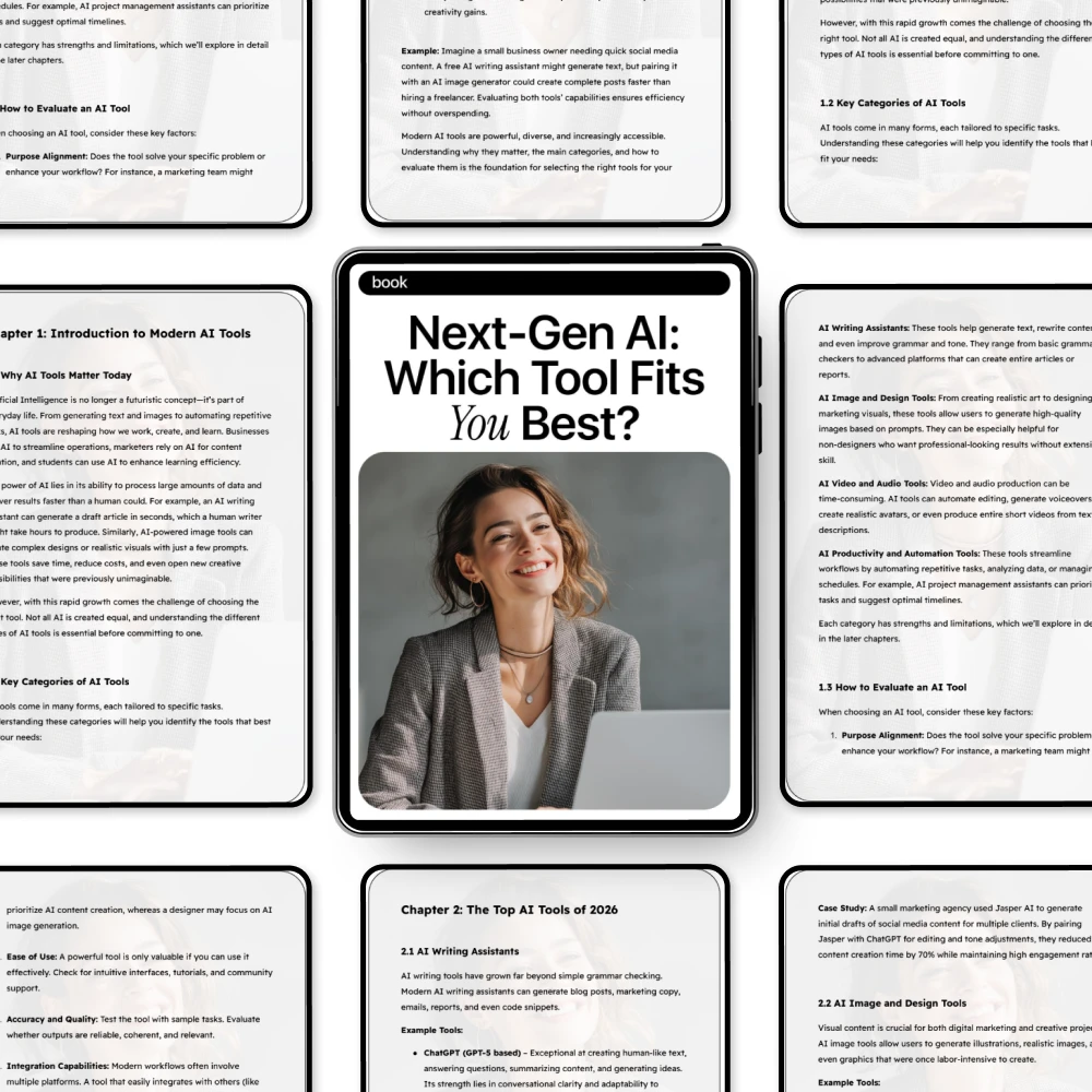 Step confidently into the future with Next-Gen AI: Which Tool Fits You Best—your clear, friendly, and insight-packed guide to navigating today’s fast-growing world of artificial intelligence. Whether you’re feeling overwhelmed by new platforms, curious about which tool matches your needs, or ready to upgrade your workflow with smarter tech, this ebook makes everything simple, practical, and easy to understand. Designed for everyday users, professionals, creators, and students, it breaks down the most important AI categories and helps you compare new ai tools comparisons without confusion.