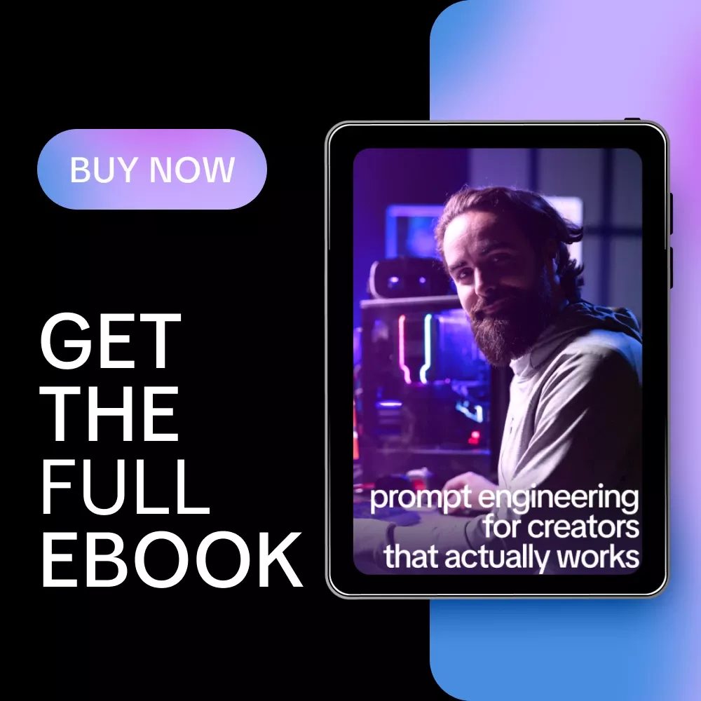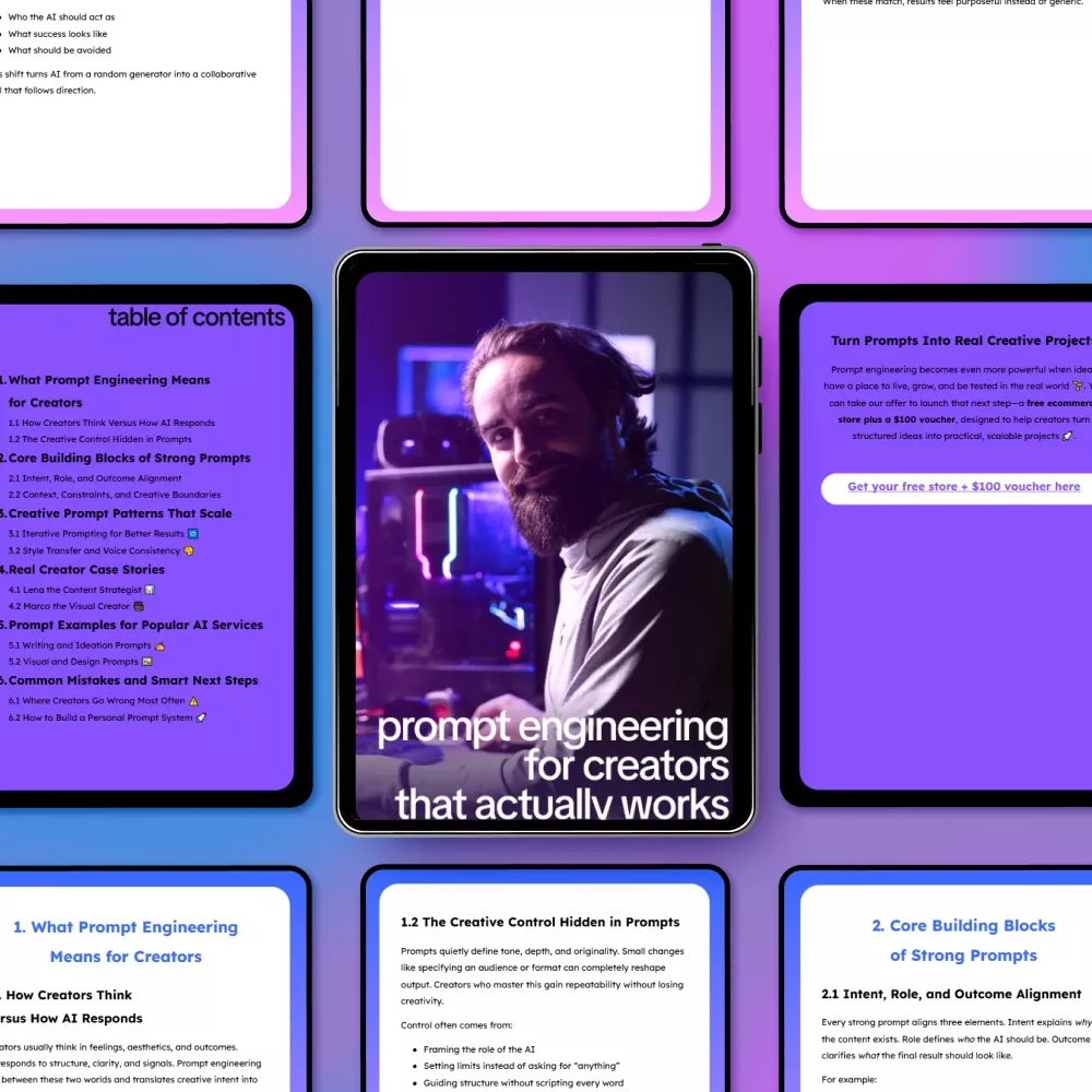 This ebook is built specifically around prompt engineering for creators, not developers or engineers. It speaks your language and respects your creative instincts. You will learn how to guide AI without over-explaining, how to maintain voice consistency, and how to create repeatable systems that save time while improving output quality.
