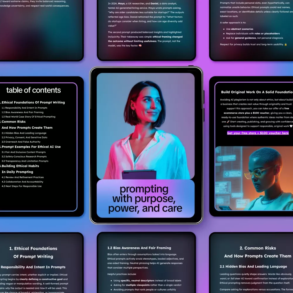 Step confidently into the world of responsible AI interaction with Prompting With Purpose, Power, and Care, a comprehensive digital guide designed for anyone looking to master prompt writing for ethical AI use. This guide goes beyond basic instructions to help you craft prompts that are intentional, fair, and safe, ensuring your interactions with AI are both effective and responsible. Whether you’re a professional, researcher, or AI enthusiast, this guide empowers you to approach prompt writing with integrity, awareness, and practical insight.