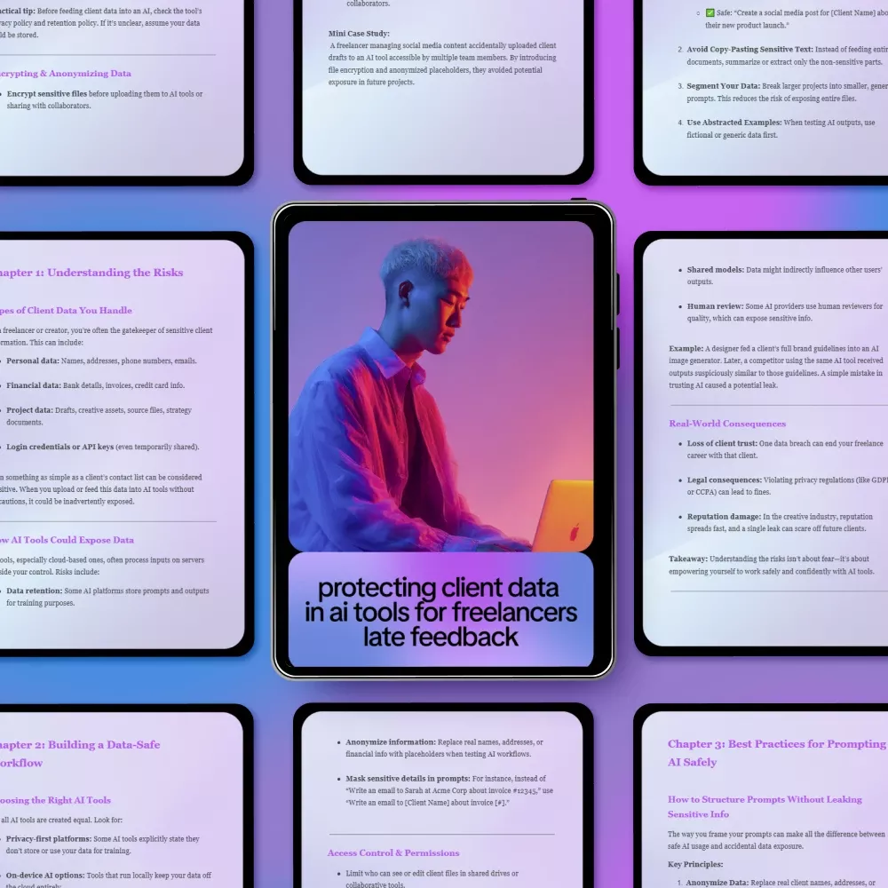 Using AI tools as a freelancer can save time, spark creativity, and boost productivity—but it can also quietly put sensitive client information at risk. Protecting Client Data in AI Tools for Freelancers is a practical, no-fluff ebook designed to help you use AI confidently without compromising trust, privacy, or professionalism. This guide breaks down the real risks, common mistakes, and proven strategies freelancers need to know when working with modern AI tools.
