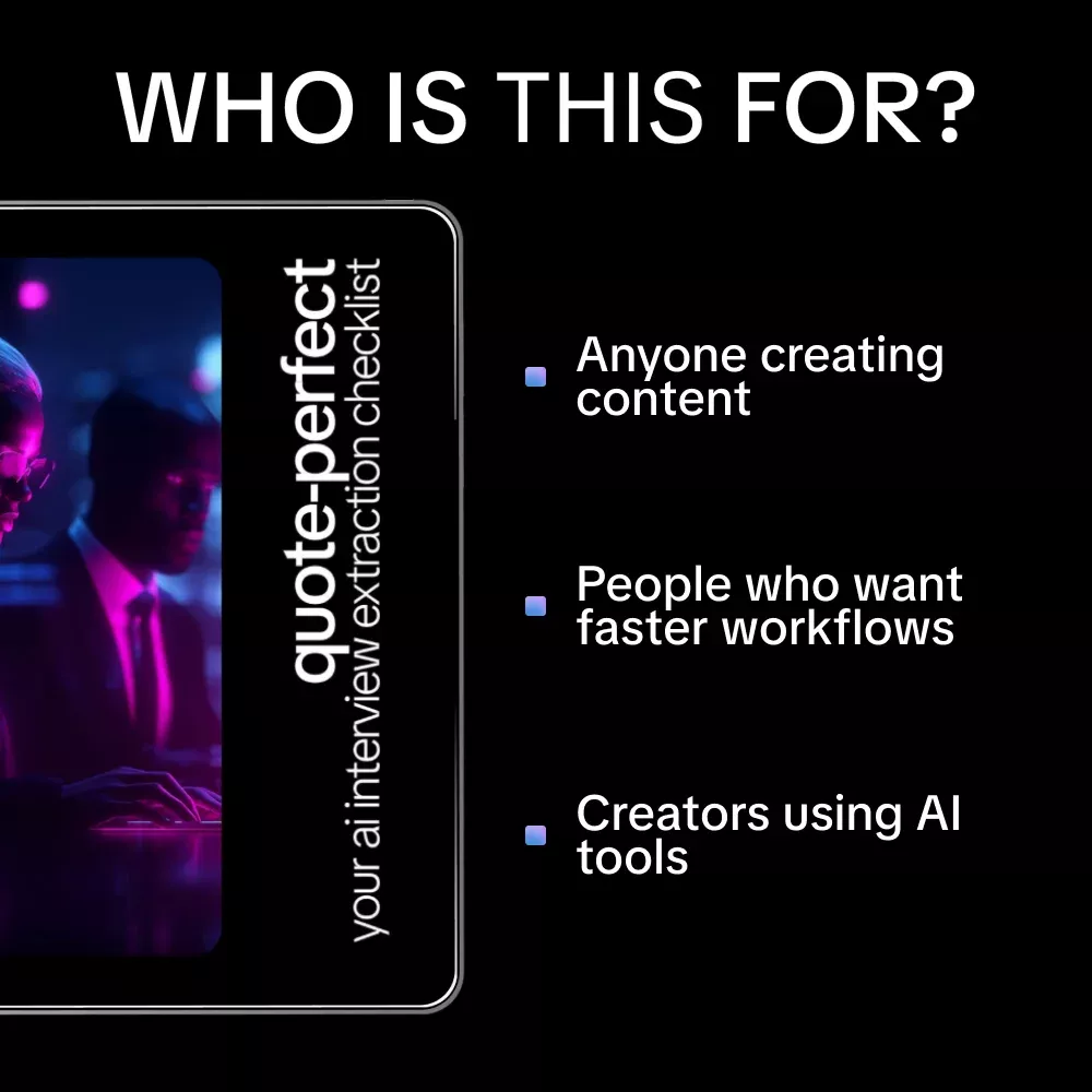 This checklist is perfect for content creators, podcasters, freelance writers, marketers, and coaches who regularly work with interviews and want a faster, smarter way to extract standout quotes. If you want results without technical overwhelm, this was made for you.