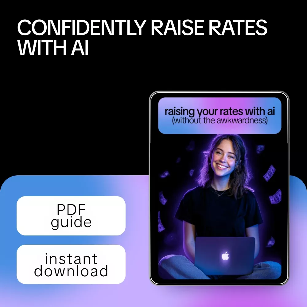 Raising your rates doesn’t have to feel uncomfortable—or risky. Raising Your Rates with AI (Without the Awkwardness) is a clear, practical, and confidence-building guide designed to help you use ai to raise your rates with confidence, backed by real data, smart insights, and messaging support. If you’ve ever hesitated to charge what you’re truly worth, this guide shows you how AI can turn uncertainty into clarity and help you communicate your value without fear or awkwardness.
