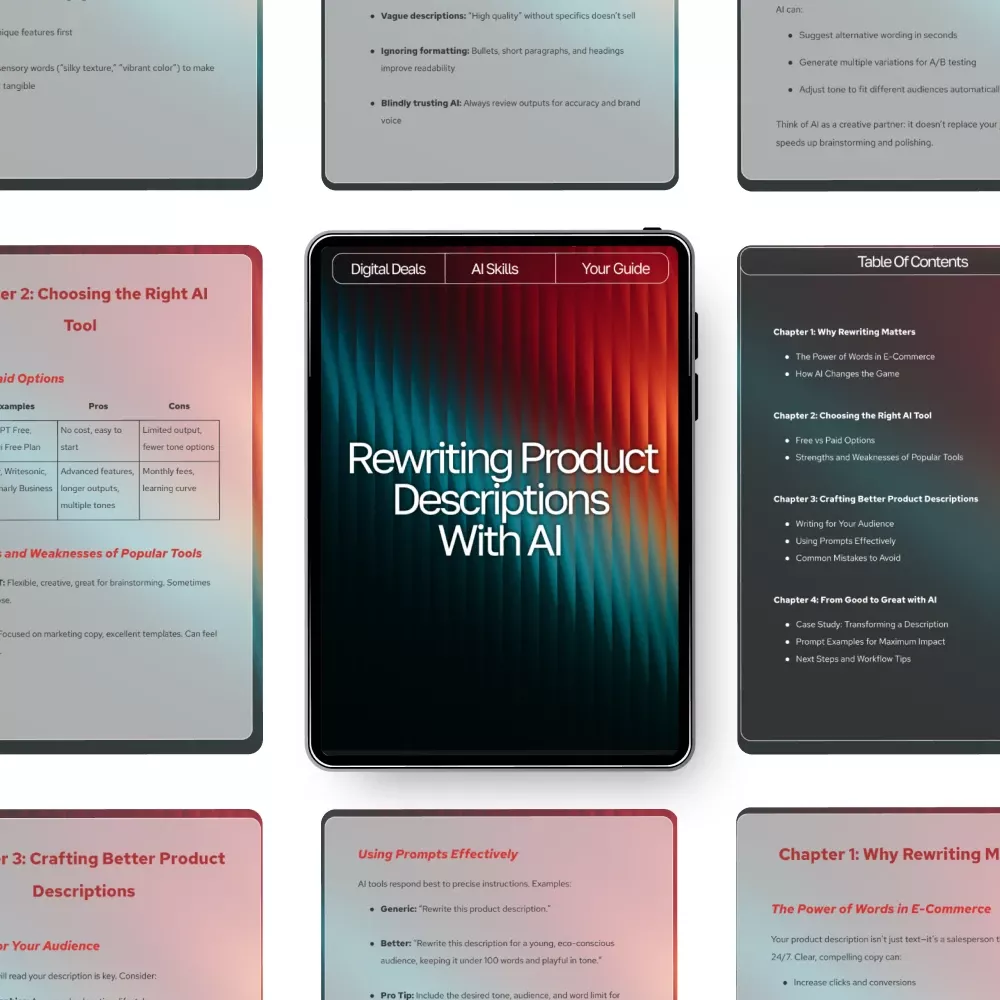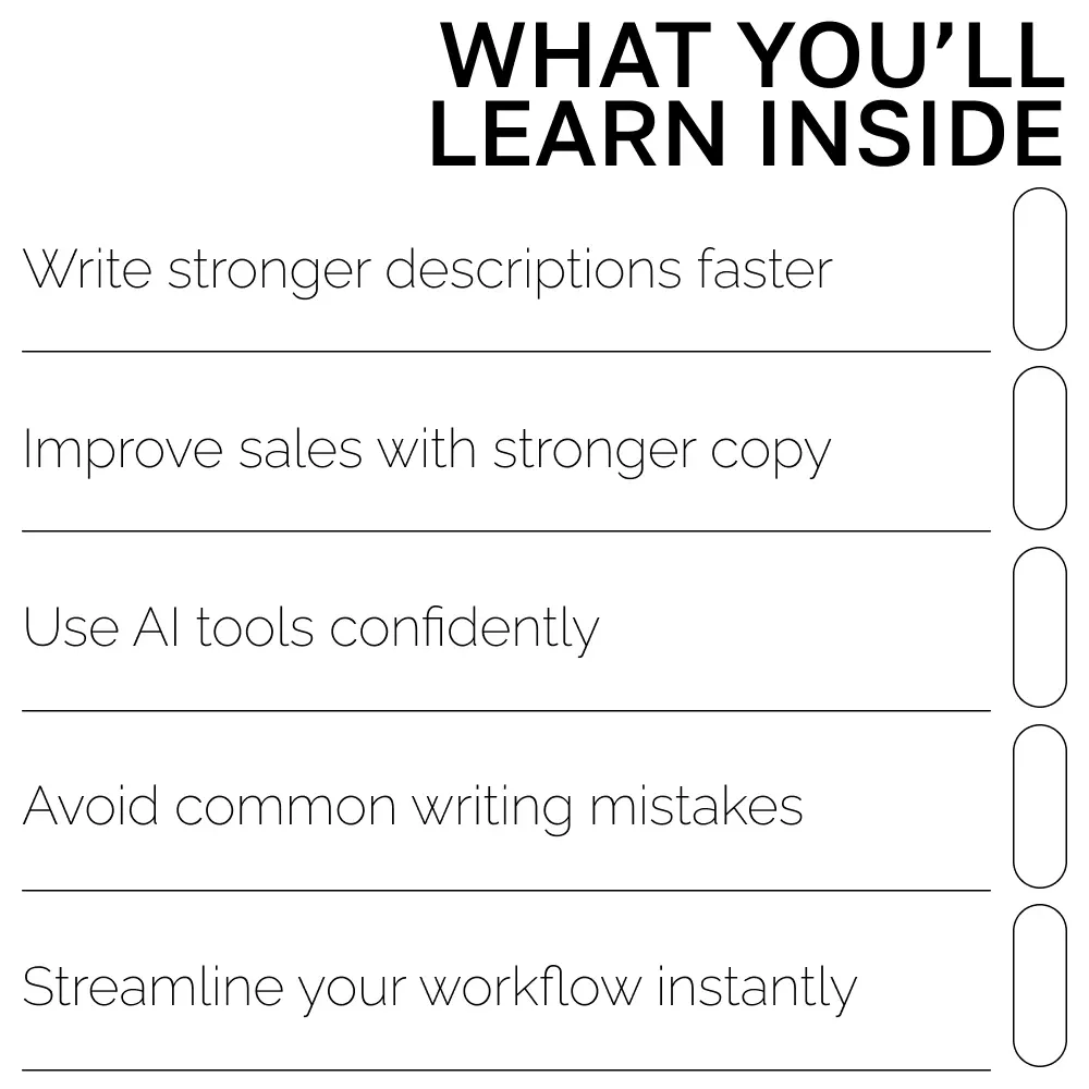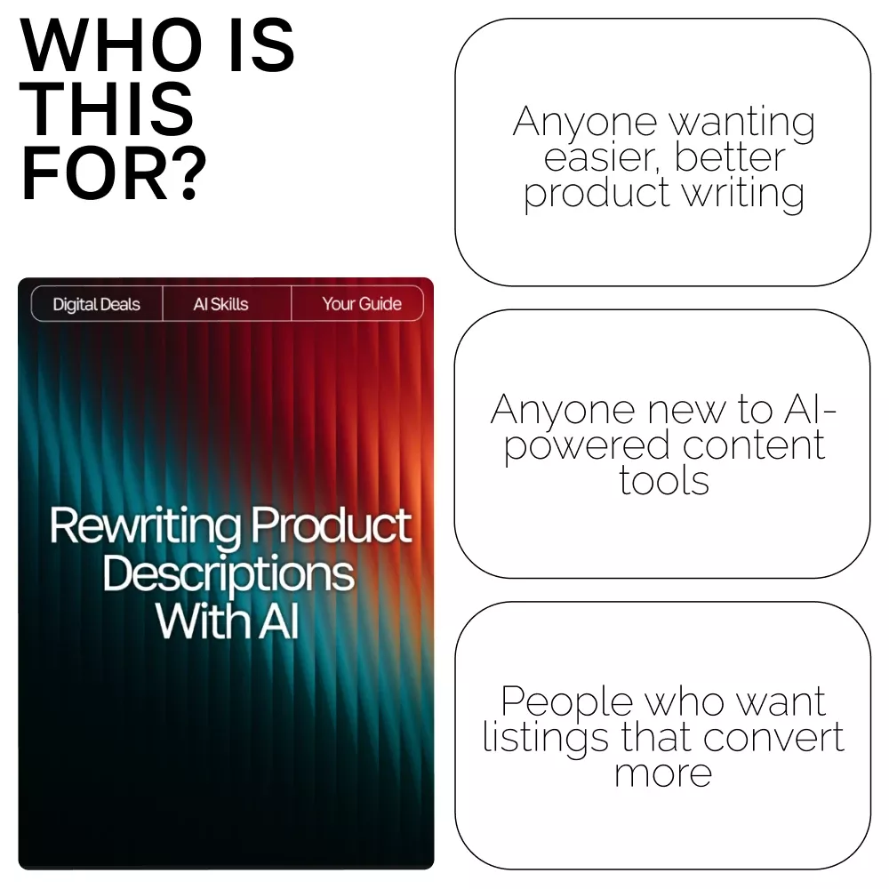 Unlike generic copywriting tips, Rewriting Product Descriptions with AI provides practical, real-world examples and step-by-step instructions you can use immediately. It’s designed specifically for online sellers who want to understand not only what to write, but how to write it using modern AI tools that simplify the whole process.