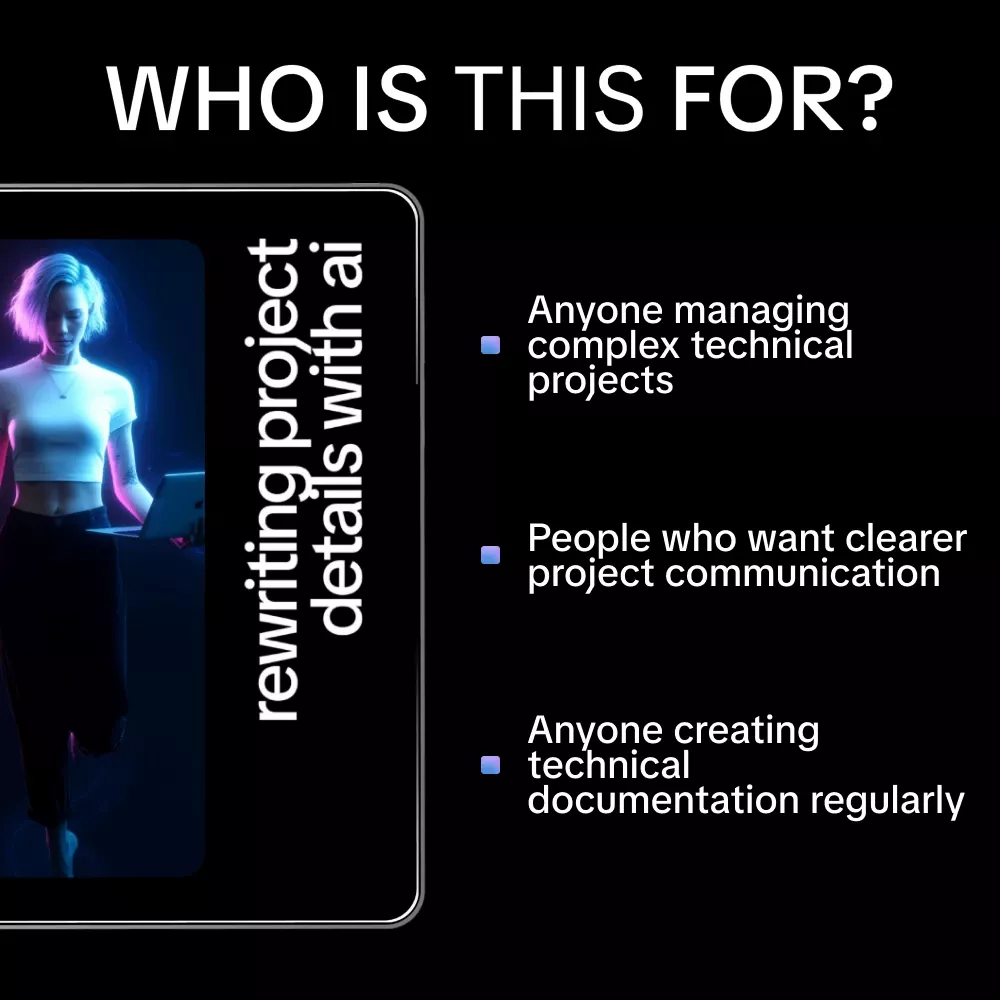 This ebook is ideal for project managers, engineers, consultants, technical writers, product teams, freelancers, and anyone responsible for documenting or explaining technical projects. If your work involves translating complex information into something others can easily understand, this resource was created for you.