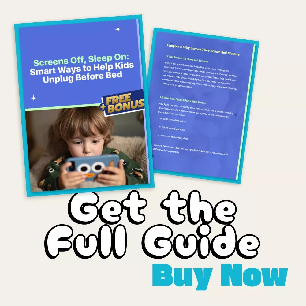 Unlike generic parenting eBooks, Screens Off, Sleep On blends modern digital know-how with compassionate, real-world advice. It doesn’t just tell you to cut screen time—it shows you how to limit screen time before bed for kids in a way that fits your family’s lifestyle. With its mix of expert guidance and AI-powered suggestions, this guide helps you turn bedtime into a moment of peace, not conflict.
