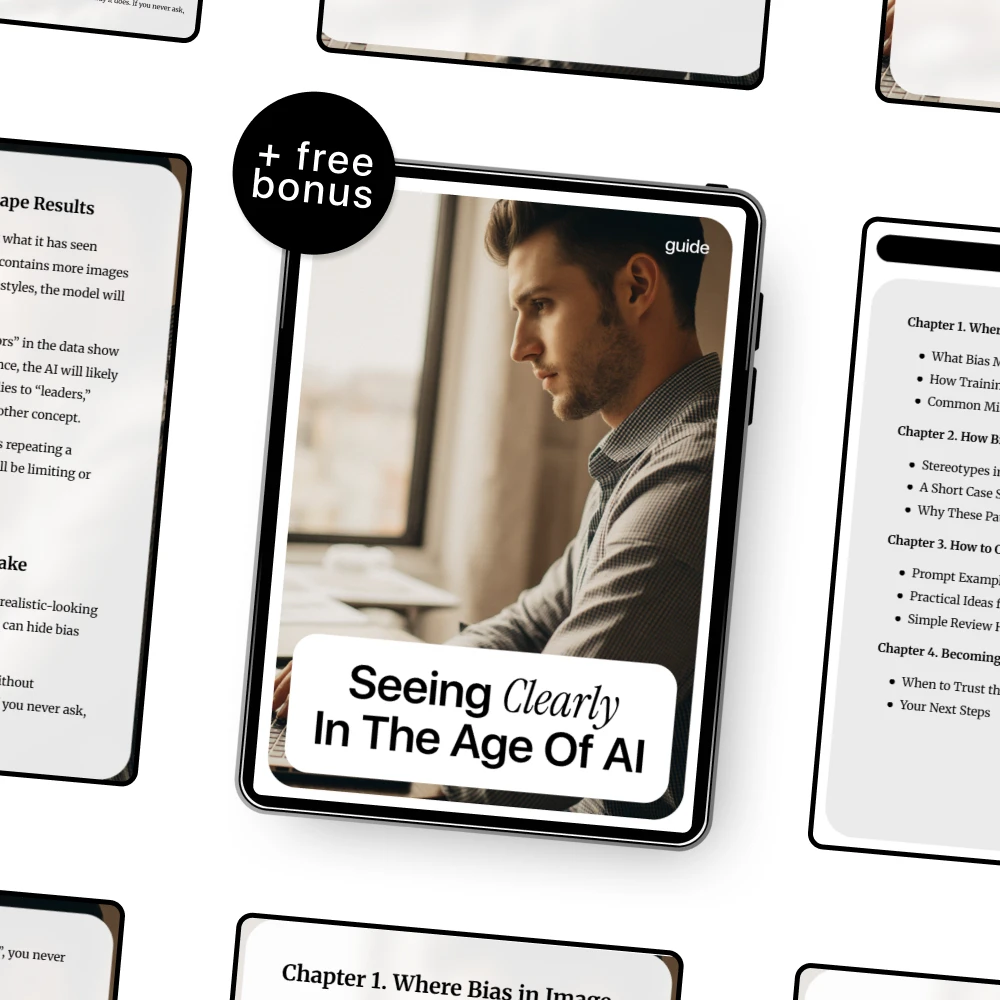 In a world flooded with AI-generated visuals, it’s easy to assume the images we see are neutral, accurate, and objective. Seeing Clearly in the Age of AI is a practical, eye-opening digital guide that helps you slow down, look closer, and understand how bias quietly shapes AI-generated images—and what you can do about it. Written in clear, human language, this guide turns a complex topic into something you can actually use in your creative work, marketing, or everyday content creation.