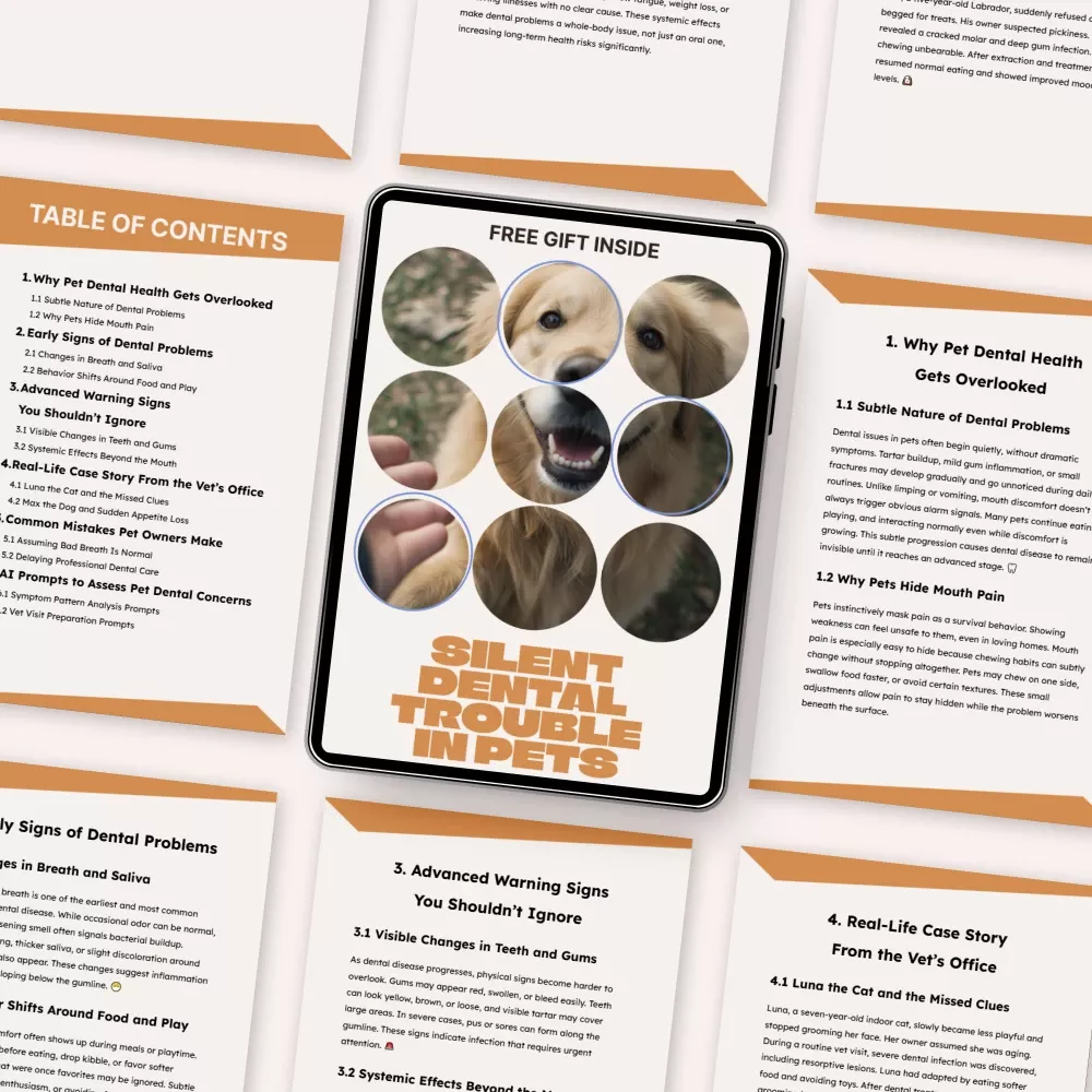 Dental disease is one of the most common yet overlooked health issues in pets. Silent Dental Trouble in Pets is a practical, eye-opening ebook designed to help caring pet owners recognize problems early—before discomfort turns into serious illness. Pets instinctively hide pain, especially in the mouth, which is why so many warning signs go unnoticed. This guide walks you through exactly what to watch for, how to interpret subtle changes, and when to take action with confidence.
