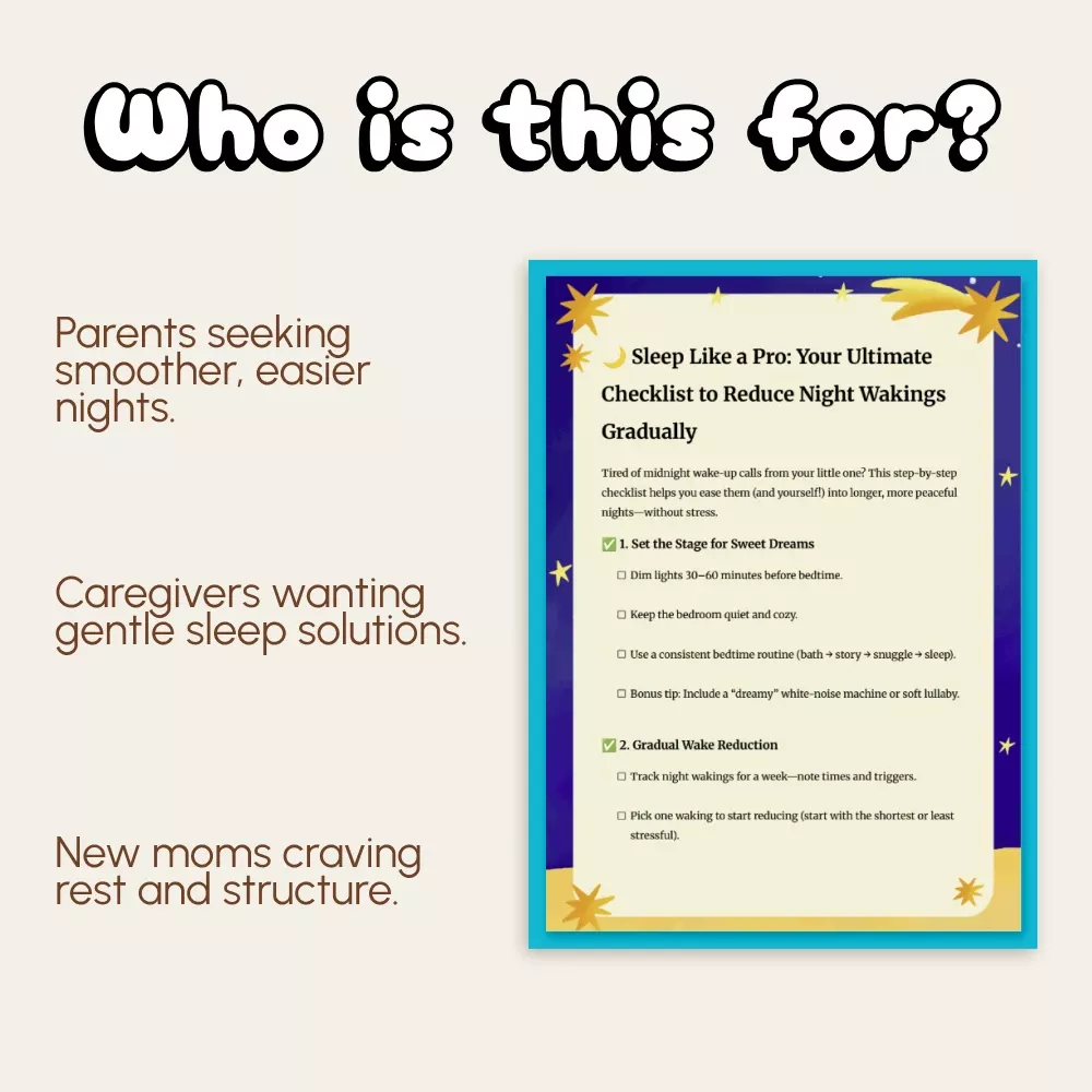 Say goodbye to sleepless nights and hello to peaceful routines. Download Sleep Like a Pro: Your Ultimate Checklist to Reduce Night Wakings Gradually today and start your journey toward restful, joyful nights for the whole family!