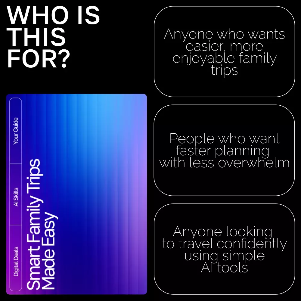 Unlike generic travel eBooks, Smart Family Trips Made Easy focuses entirely on real-life family needs and shows you exactly how to use AI tools with kids in mind. With actionable prompts, parent-tested strategies, and a warm, supportive tone, this guide helps you plan trips that feel effortless—and fun.