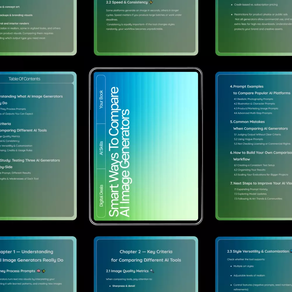 Unlock the secrets to choosing the right AI art tool with this comprehensive digital guide: Smart Ways to Compare AI Image Generators. Whether you’re a beginner experimenting with prompts or a professional creator searching for consistent, high-quality output, this ebook shows you exactly how to compare AI tools with clarity and confidence. Packed with practical insights, real examples, and side-by-side tests, it’s your essential roadmap for understanding how to compare ai image generators in today’s fast-moving creative landscape.