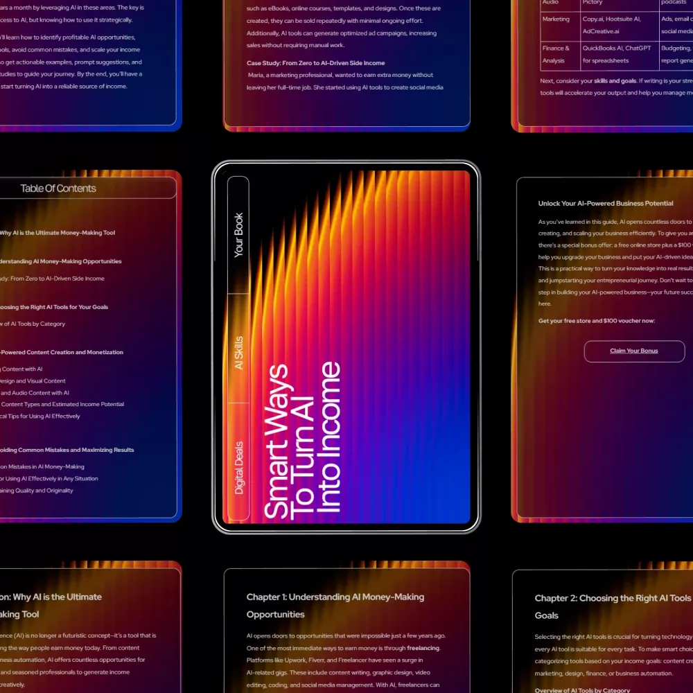 • Chapter 3: AI-Powered Content Creation and Monetization (writing, design, video, audio)