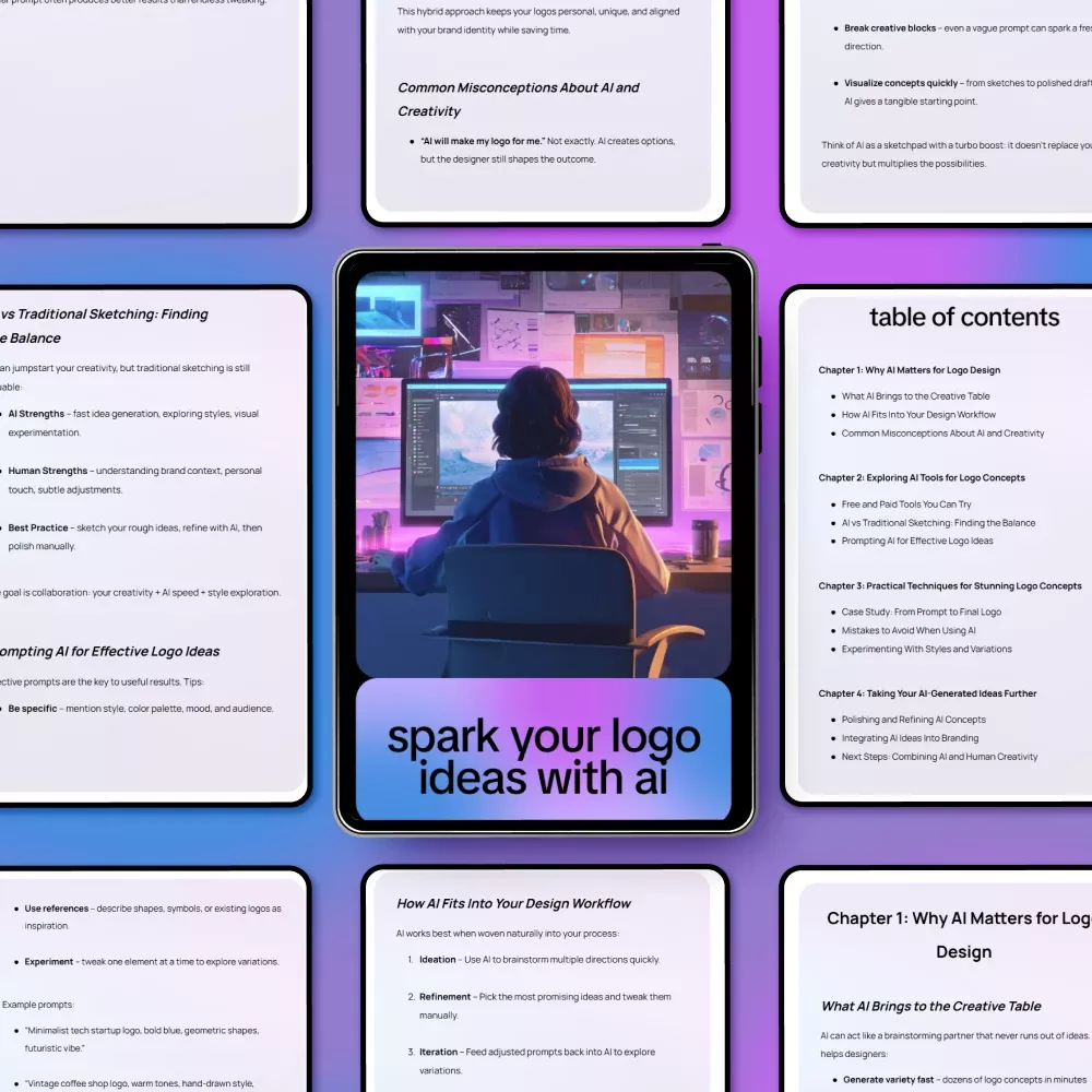 Step into the future of branding with Spark Your Logo Ideas with AI, a comprehensive digital guide designed to inspire and elevate your logo creation process. Whether you’re a seasoned designer or just starting out, this eBook walks you through how AI can become your creative partner, helping you generate unique and memorable logos faster than ever. From understanding the role of AI in design to mastering practical techniques for stunning logo concepts, this guide is your roadmap to merging technology and creativity seamlessly.