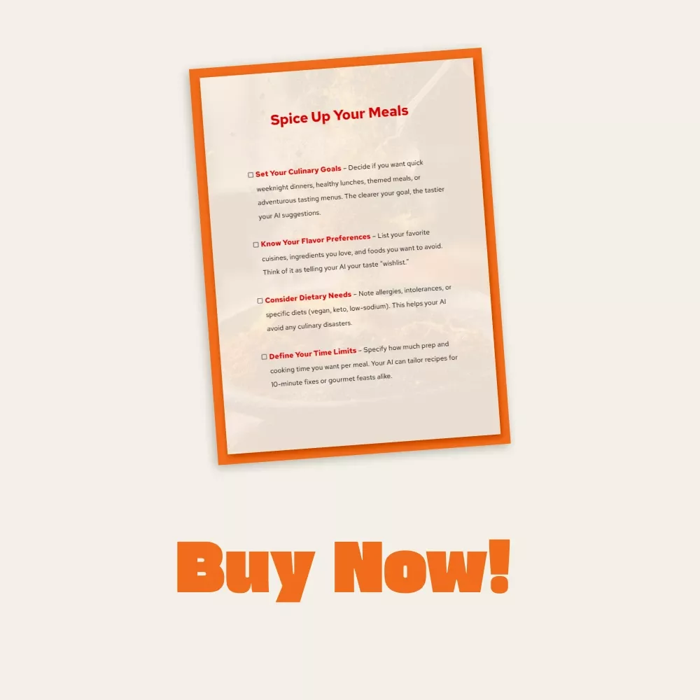 Don’t let dinner boredom win. With Spice Up Your Meals, you’ll learn how to ask AI for meal variety planners that perfectly match your taste, time, and lifestyle. Download your digital checklist today and start crafting meals that are as inspired as you are. Your next favorite dish is just a question away!