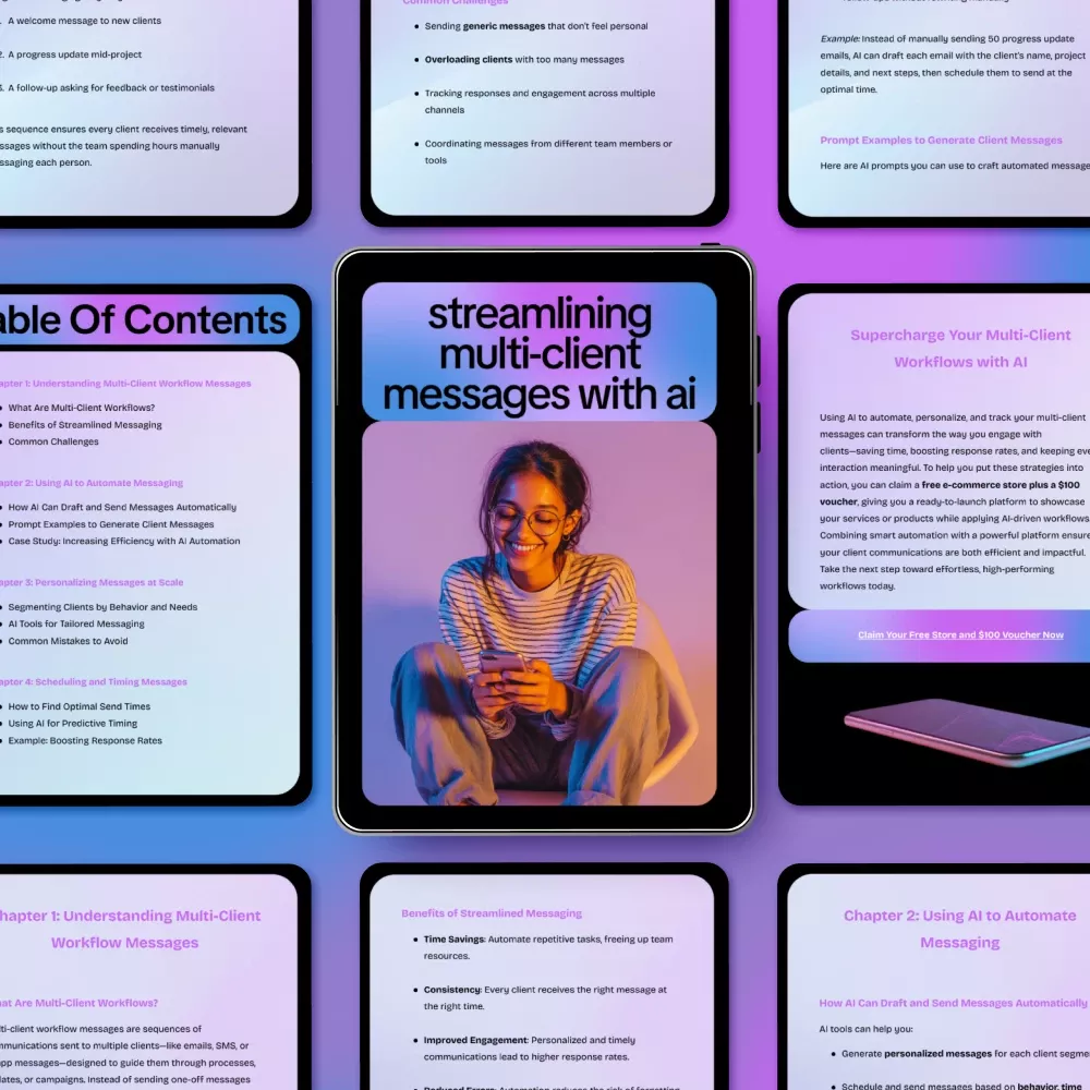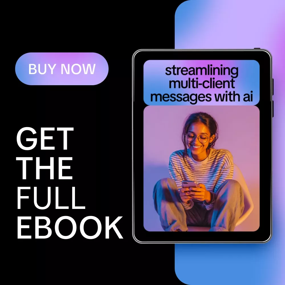 Managing messages for multiple clients can be overwhelming, time-consuming, and prone to mistakes. Streamlining Multi-Client Messages With AI is the ultimate digital guide designed to help professionals, freelancers, and agencies harness the power of artificial intelligence to simplify and enhance multi-client workflow messaging. Whether you’re struggling to keep up with client communications or looking for smarter ways to automate and personalize messages, this eBook shows you exactly how to use AI for multi client workflow messages efficiently and effectively.