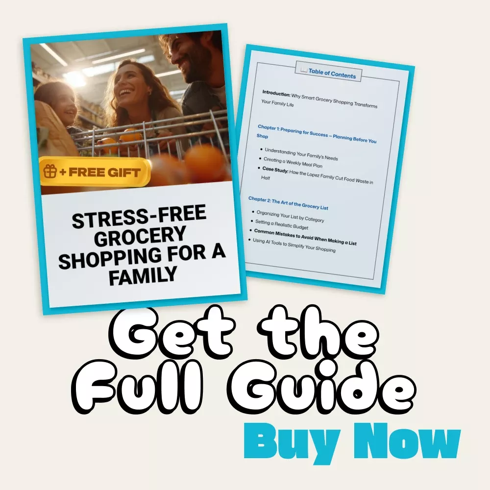 Unlike generic meal planning eBooks, this guide blends proven organizational strategies with modern tools — including AI-powered shopping assistance — to make your grocery experience efficient and stress-free. You’ll find practical advice, relatable family examples, and step-by-step tips you can start using immediately.