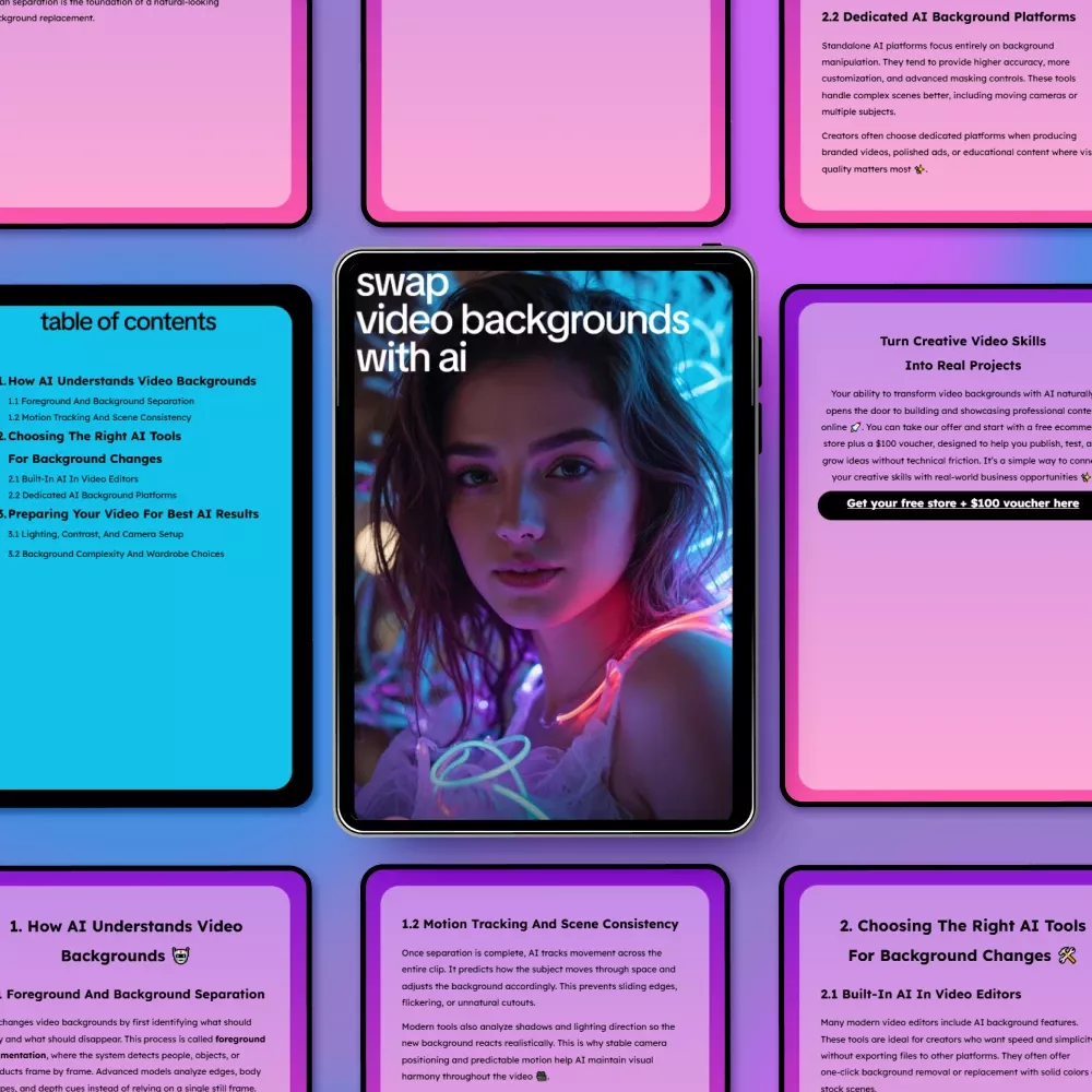 Turn ordinary videos into professional, eye-catching content without a studio, green screen, or expensive gear. Swap Video Backgrounds With AI is a practical, easy-to-follow ebook that shows you exactly how modern AI tools analyze video footage and replace backgrounds seamlessly. Whether you’re filming social media content, online courses, or marketing videos, this guide gives you clear strategies to achieve polished results using ai to change the background in a video—even if you’re a beginner.