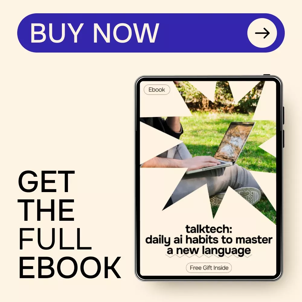 Discover a revolutionary way to learn a new language with TalkTech: Daily AI Habits to Master a New Language. This digital eBook is designed to help you harness AI for practicing a new language daily, turning every day into a meaningful learning experience. Whether you’re a beginner or looking to polish your skills, this guide offers practical strategies, actionable routines, and advanced AI techniques to make language learning effortless, enjoyable, and effective.