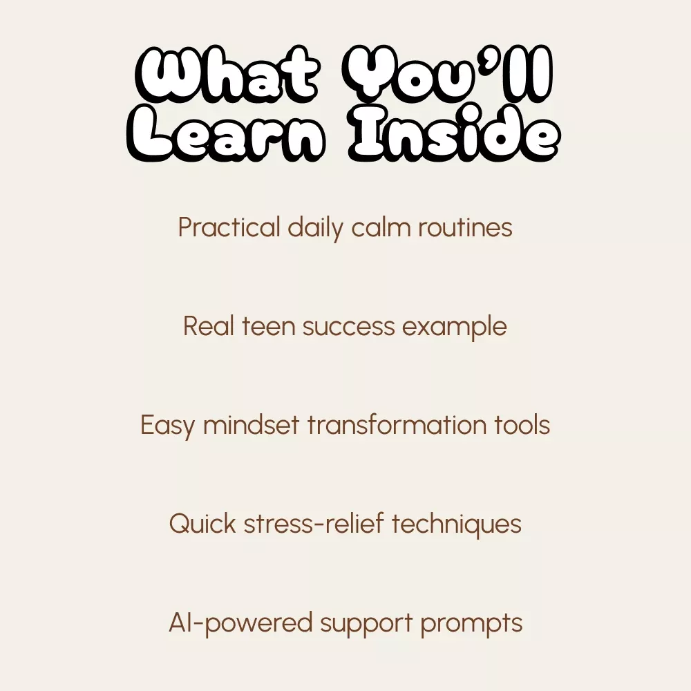 • Chapter 2: Practical Strategies to Manage Stress – Mindset shifts that work, everyday stress-busters, and a case study of a teen’s journey from overwhelm to calm.