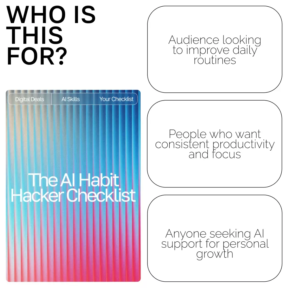 This isn’t just another habit tracker. Unlike generic habit planners, The AI Habit Hacker Checklist integrates AI help maintaining daily habits to provide personalized suggestions, real-time reflection prompts, and actionable feedback. It’s ideal for busy professionals, students, entrepreneurs, or anyone who struggles with consistency. The checklist’s AI-driven approach makes it unique, turning habit tracking into a smart, supportive, and enjoyable experience.