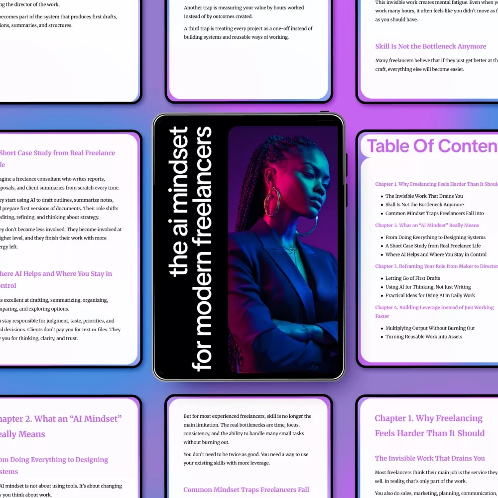 Stop struggling with invisible work and endless tasks. Download The AI Mindset for Modern Freelancers today and start transforming your freelance career. Leverage AI, build systems, and enjoy a smarter, more productive work life.
