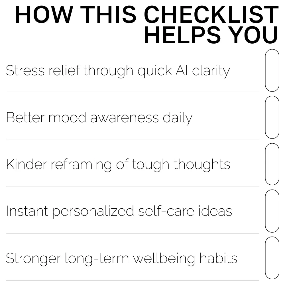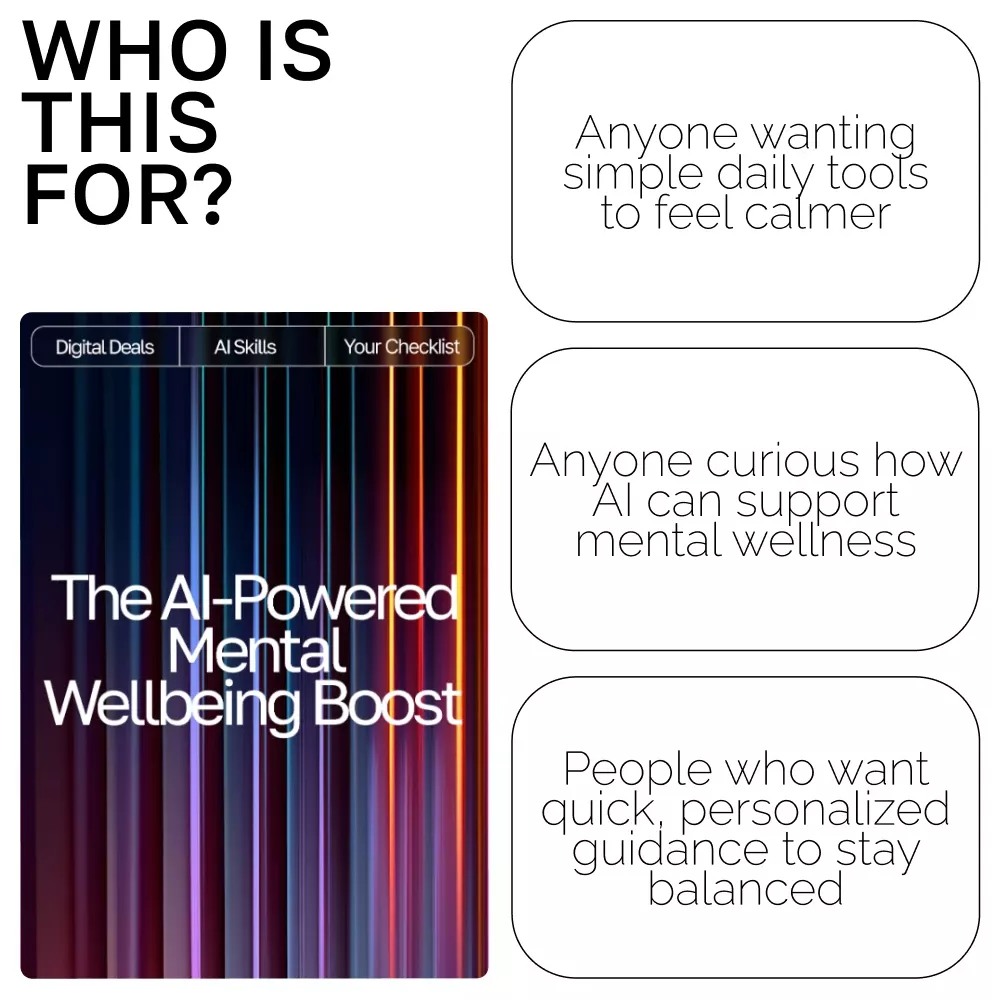 This digital checklist is perfect for anyone seeking practical, easy ways to improve mental wellbeing—students, professionals, parents, creators, and anyone curious about ways to boost mental wellbeing with ai. If you want supportive prompts that fit seamlessly into daily life, this is for you.